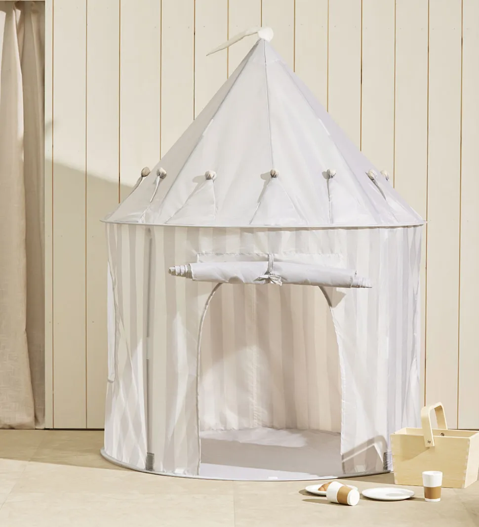 Fint Kids Concept legetelt i grå med hvide striber. Teltet har et hvidt flag i toppen.