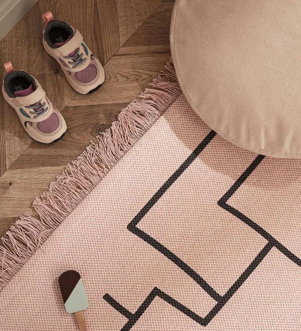 Pænt Kids Concept tæppe i støvet rosa med et fint sort mønster, og der er fine frynser i hver ende.