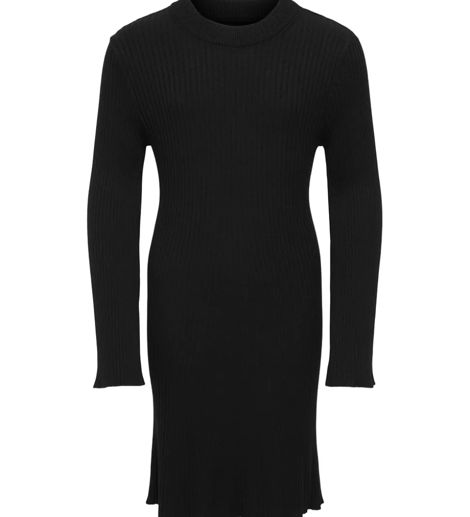Stilren Kids Only kjole i sort med en ribbet struktur. Kjolen har lange ærmer og en rund halsudskæring, som skaber et enkelt udtryk. Kids Only kjolen er alsidig i designet med sin minimalistiske stil.