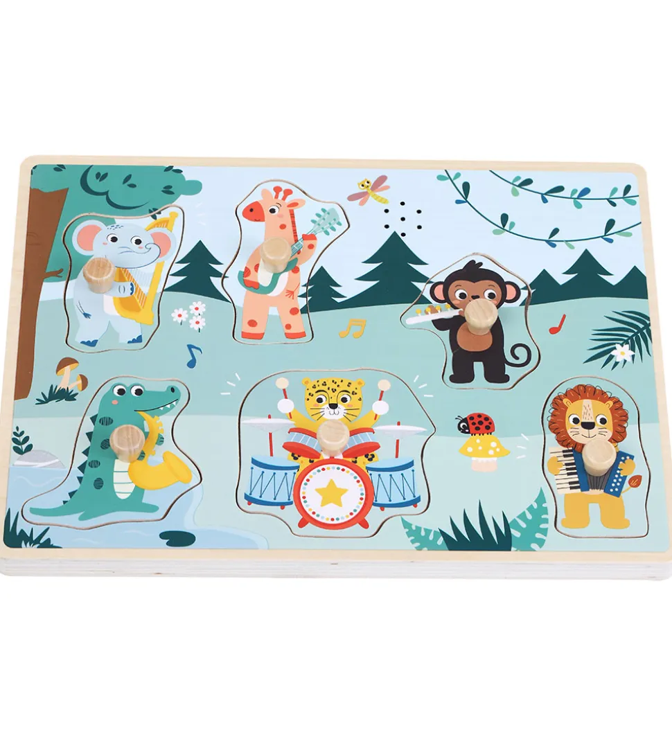 Farverigt puslespil fra Kinder and Kids med et sjovt dyremotiv, der inkluderer en giraf, elefant, abe, leopard, løve, og krokodille, som alle spiller på instrumenter. Puslespillet præsenterer en livlig skovscene, der stimulerer barnets fantasi og sans for detaljer, og hver brik kan få instrumentet til at spille.