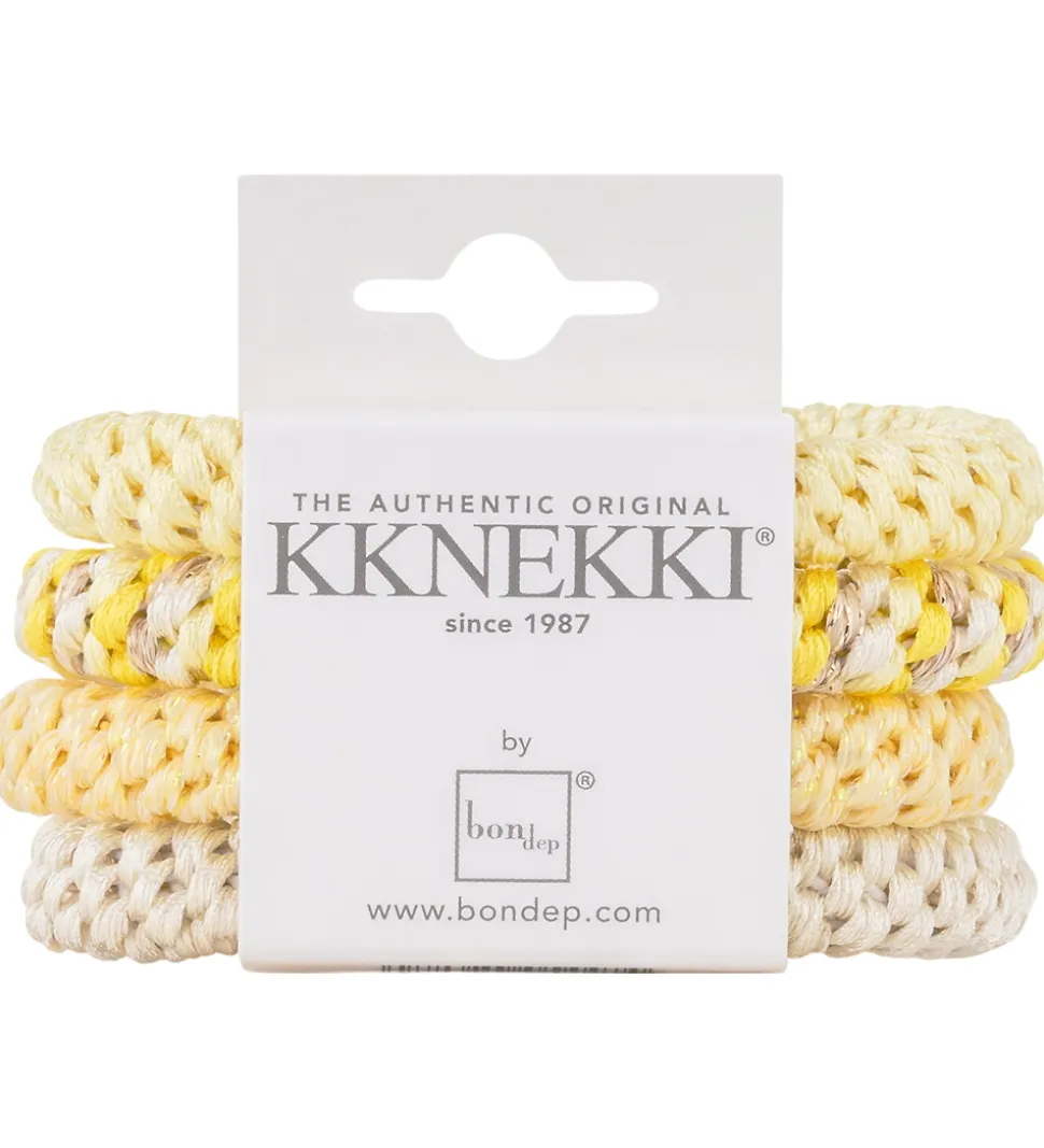 Kknekki hårelastikkerne består af mange smalle elastikker, som er strikket sammen med en masse tynde tråde. Hårelastikkerne fra Kknekki har en fantastisk, afrundet plastiksamling på midten der ikke river eller knækker hårene.