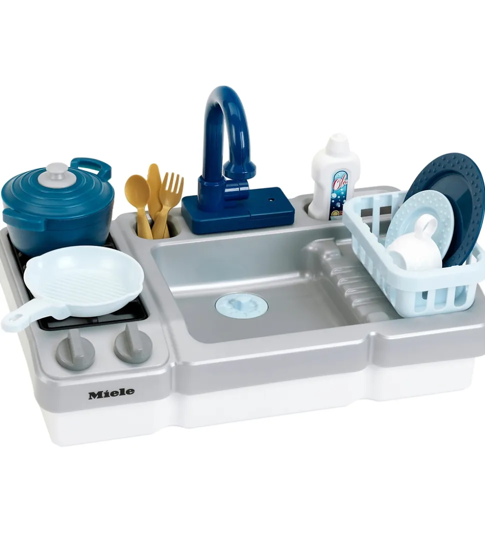 Klein minikøkkenets vandhane kan fyldes med vand, så der kan løbe ud af vandhanen.
