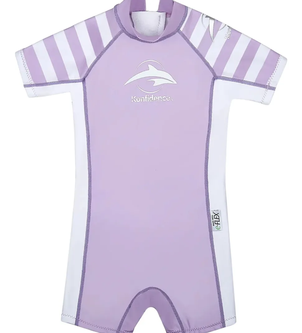 Fin Konfidence badeheldragt i lyslilla med hvide striber på ærmerne, og ned ad siderne er den hvid.