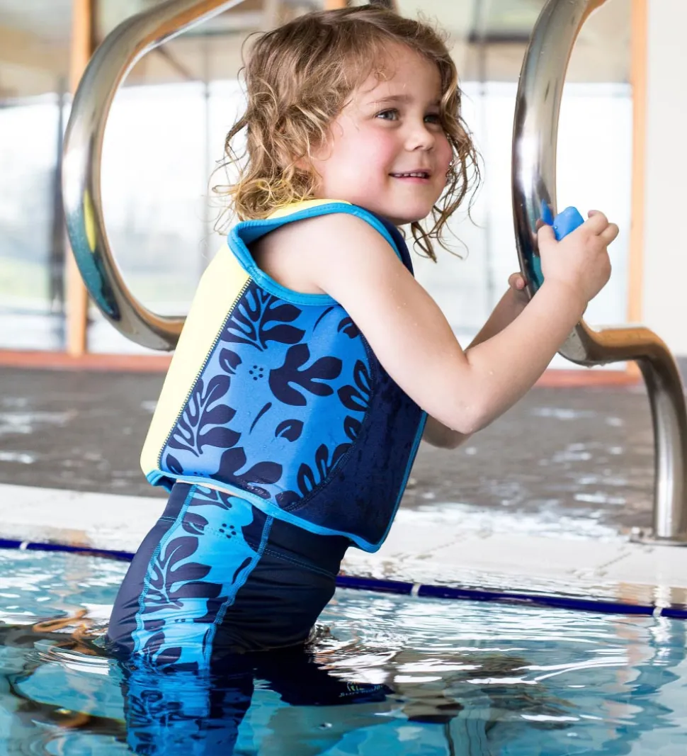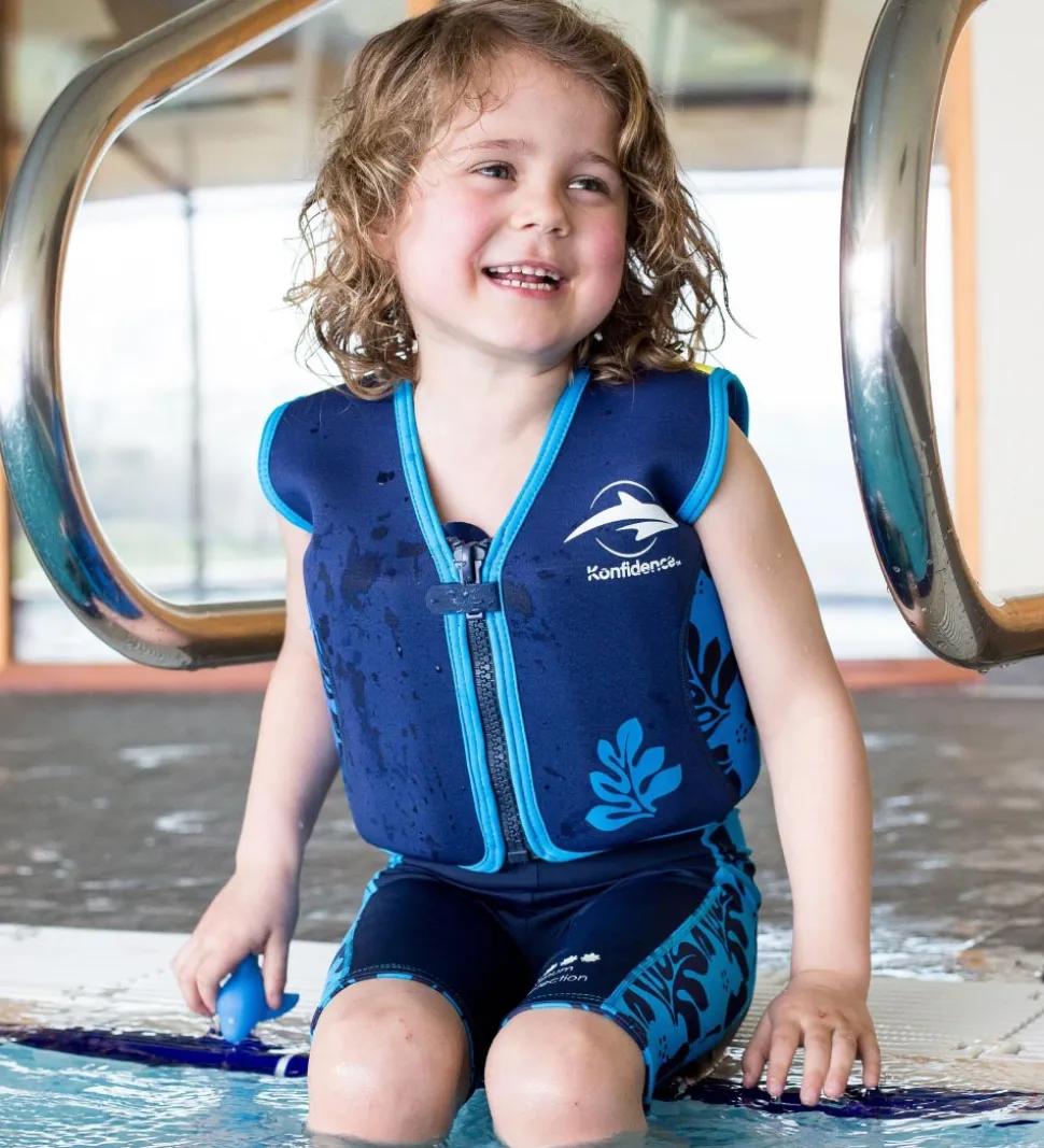 Lækker Konfidence svømmevest i blå og navybål med bladmønster og print af Konfidences velkendte delfinlogo på venstre bryst. Der står “The Original Konfidence Jacket” omme på ryggen, som er gul for at gøre svømmevesten synlig i vandet. Svømmevesten er fremstillet i blød og behagelig neopren, som er et fleksibelt materiale, der også er i våddragter. Neopren beskytter ligeledes mod solens UV-stråling, samtidig med den holder på barnets kropsvarme både i og ude af vandet.