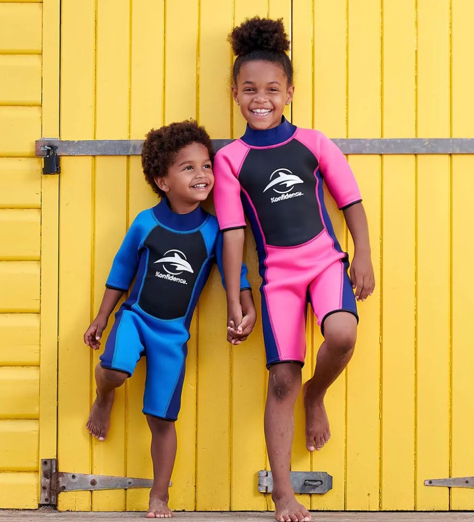 Konfidence våddragten har høj hals og korte arme og ben med gummikanter. Våddragten lukkes bagtil med lynlås, som har en indvendig søjle, der sikrer, at lynlåsen ikke kommer i kontakt med huden. Lynlåsen har også en velcrostrop øverst, som holder den lukket, og desuden et langt bånd på selve lynlåsen, så dit barn selv kan lyne op og ned.