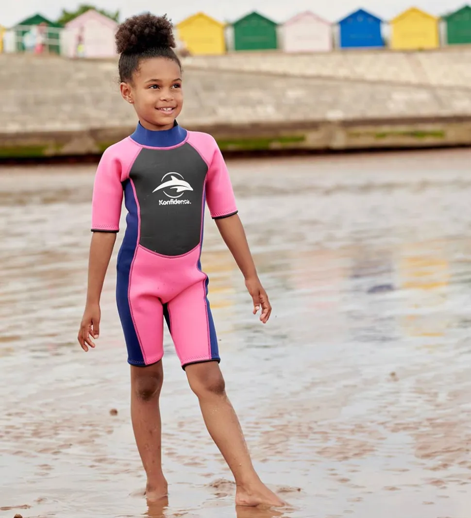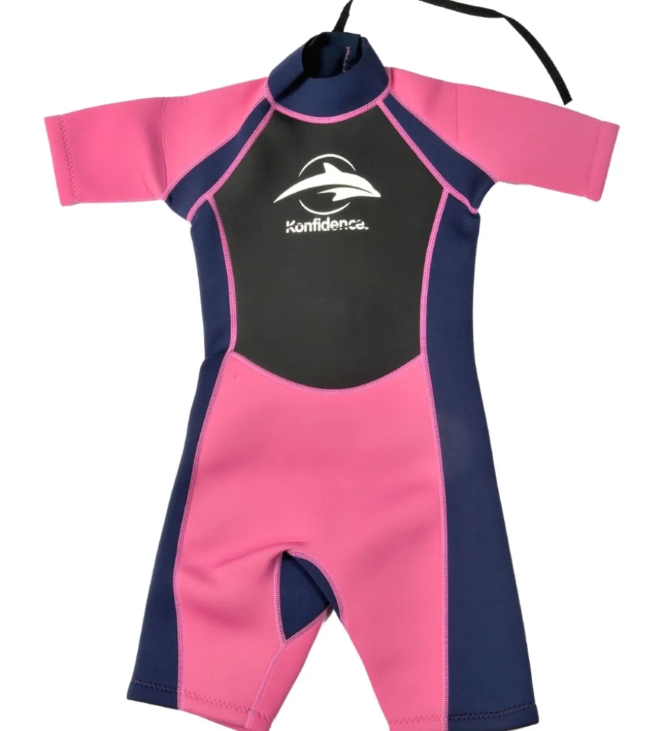 Flot Konfidence våddragt i pink, mørkelilla og sort med Konfidences velkendte delfinlogo på brystet. Våddragten er fremstillet i blød og behagelig neopren, som er et fleksibelt materiale, der også beskytter 100% mod solens UV-stråling, samtidig med den holder dit barn varmt både i og ude af vandet.