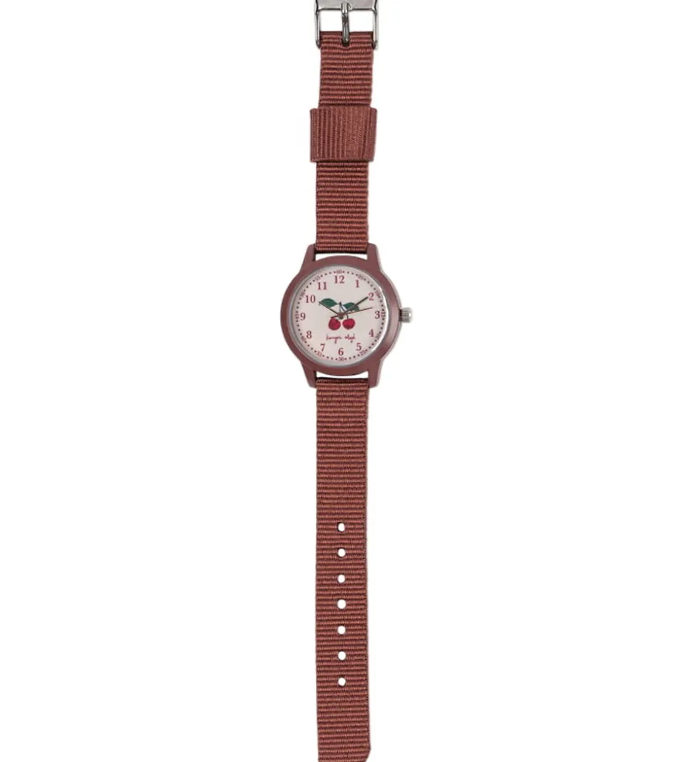Flot Konges Sløjd armbåndsur i brunt tekstil, og i indei urkassen er det dekoreret med røde kirsebær.