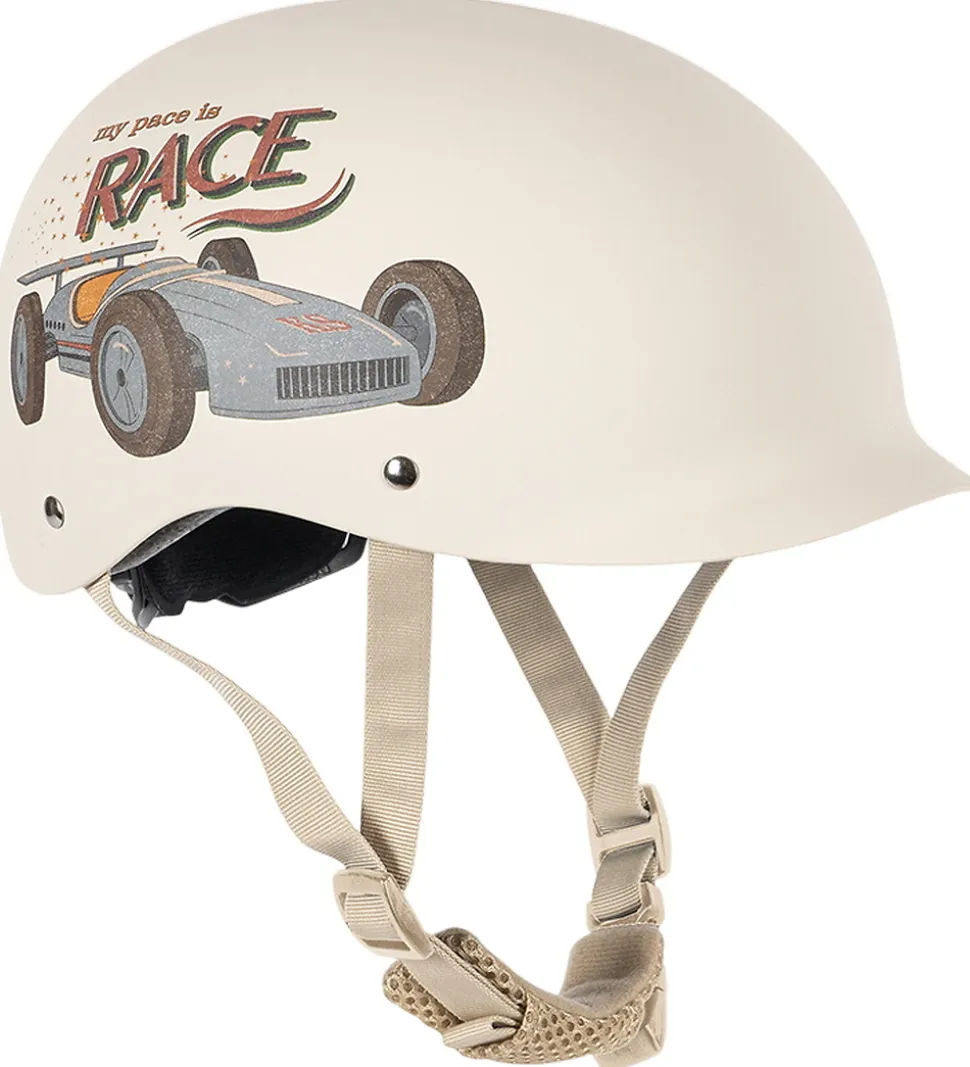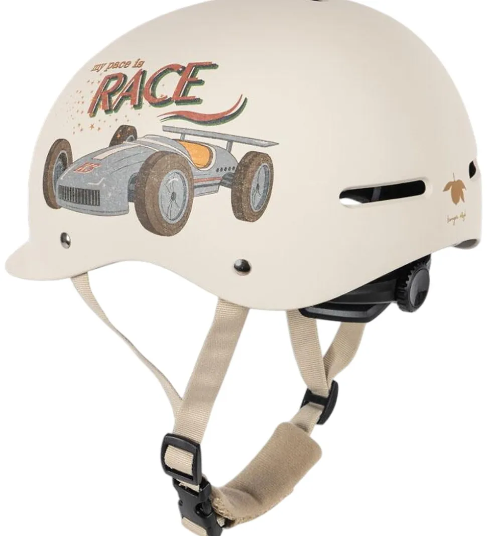 Sej Konges Sløjd cykelhjelm i lysebeige med print af to racerbiler.