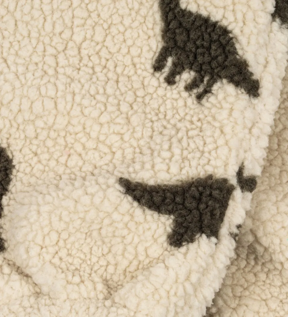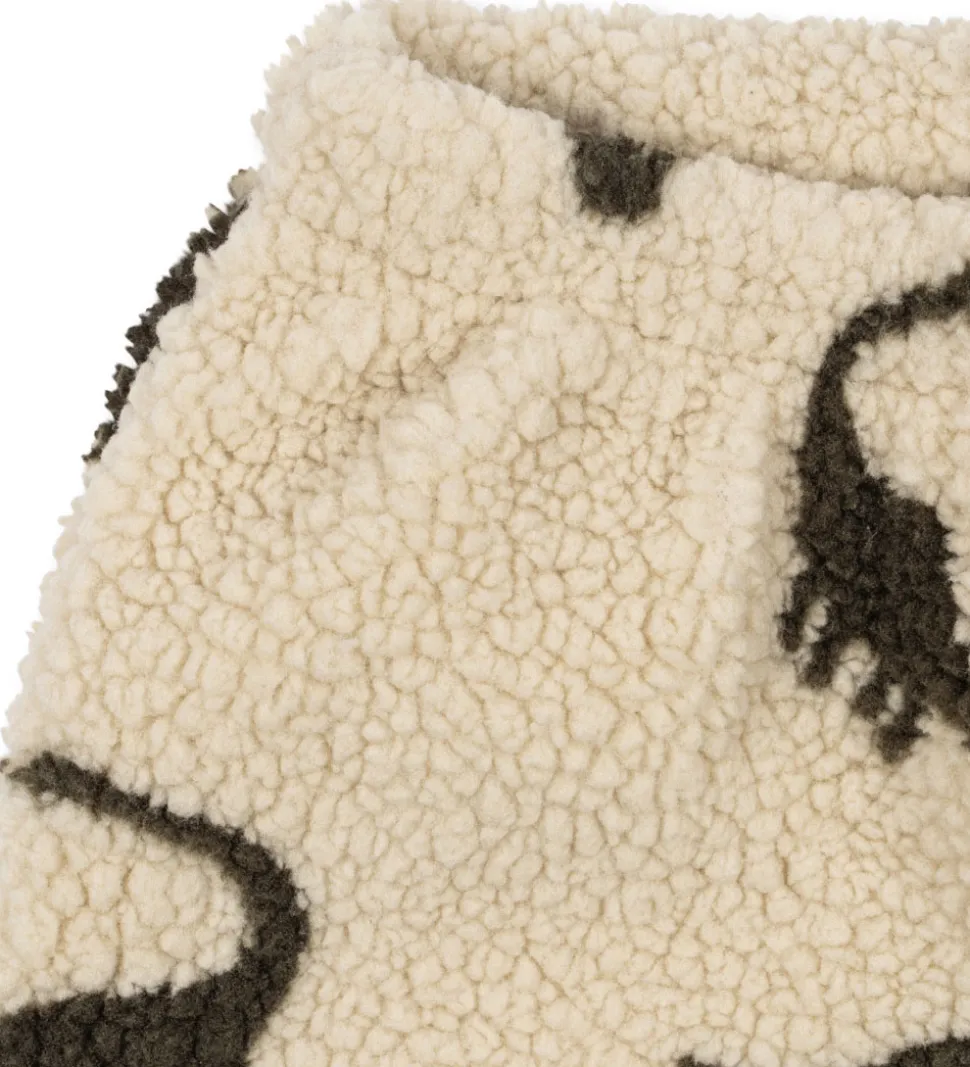 Bløde Konges Sløjd fleecebukser i en varm, cremefarvet tone med et charmerende dinosaurprint i mørkegrøn.