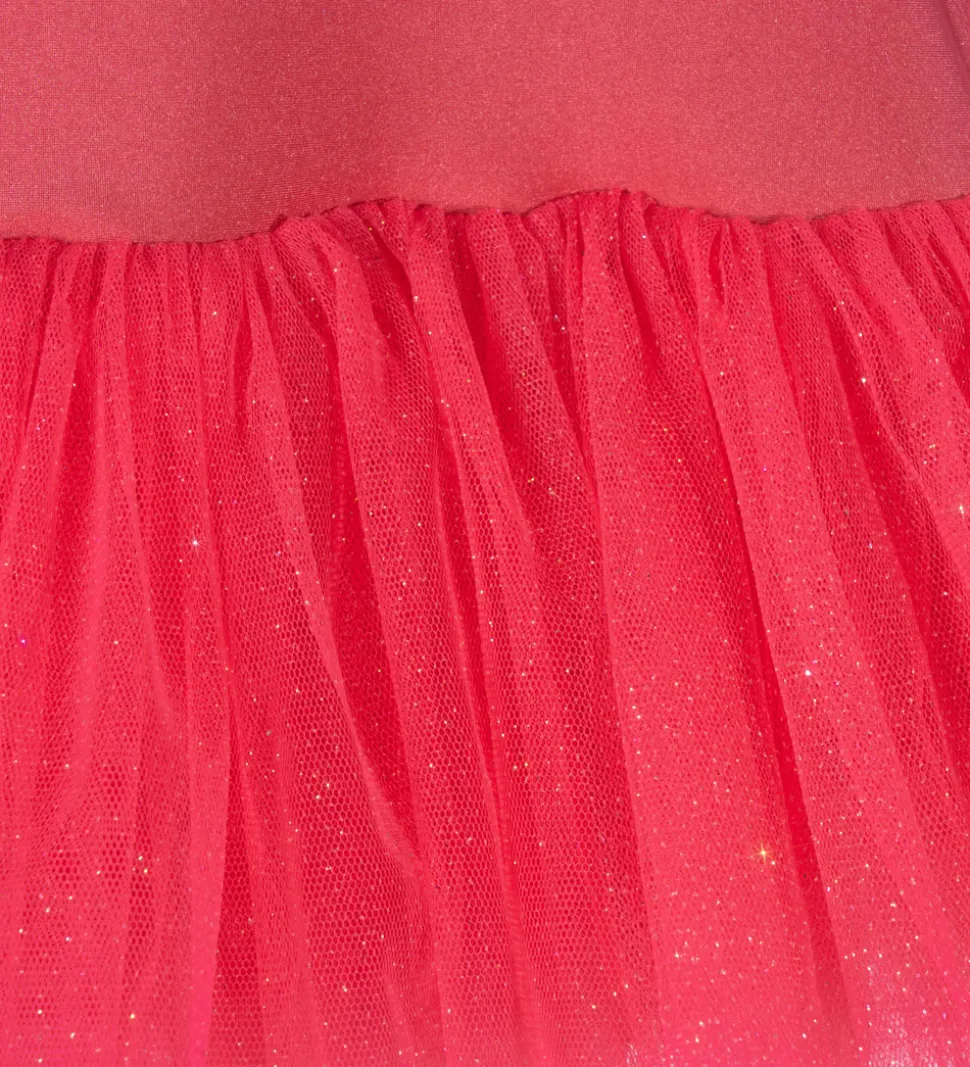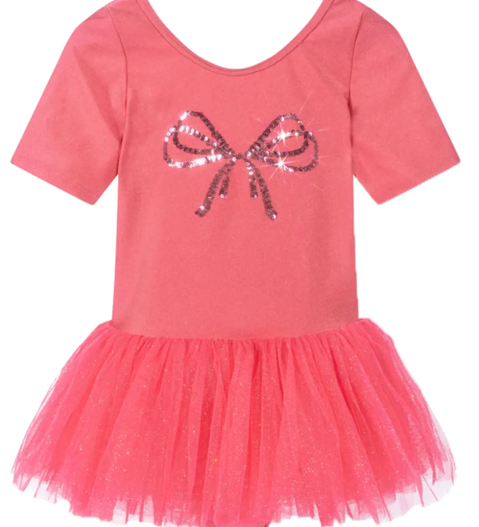 Skøn Konges Sløjd gymnastikdragt med korte ærmer i en lys koralnuance. Dragtens front prydes af et funklende båndmotiv i glitter, hvilket giver et legende udtryk.