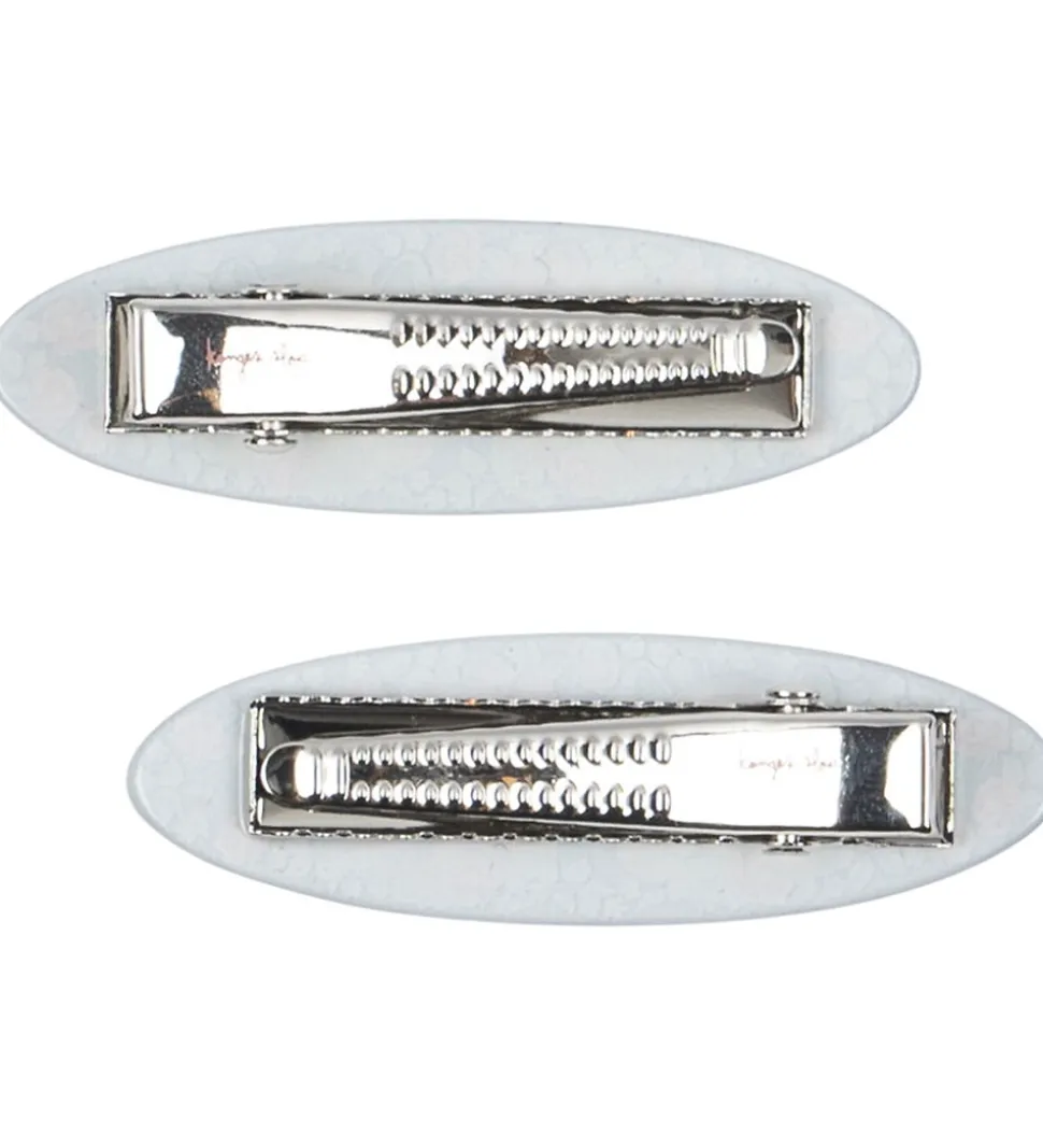 Søde Konges Sløjd hårspænder i sort med to hunde omgivet af blomster i rød og grøn. Hårspænderne sælges i en 2-pak, og de sættes fast i håret med et lille spænde bagpå.