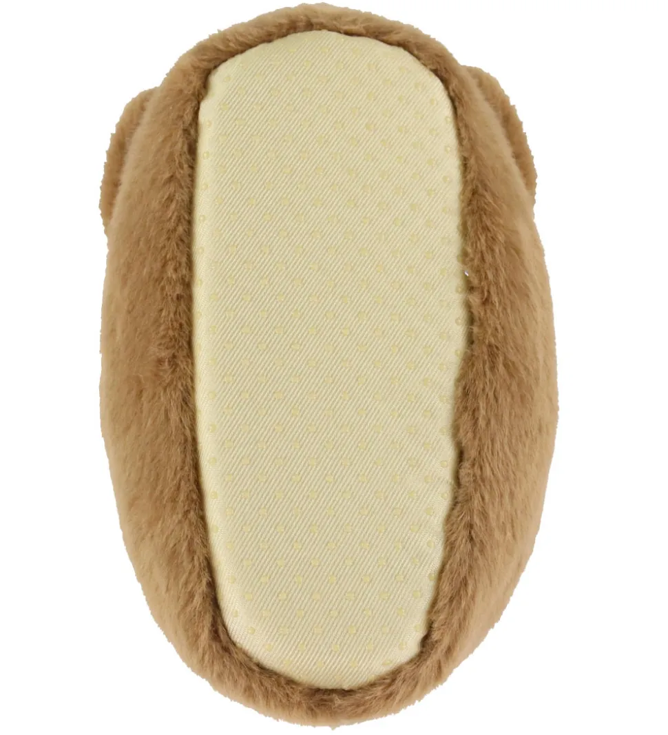 Charmerende Konges Sløjd hjemmesko i brunt plys. Hjemmeskoene har et sødt hundeansigt på fronten, der skaber et hyggeligt udtryk. Perfekt til små fødder, der fortjener komfort.