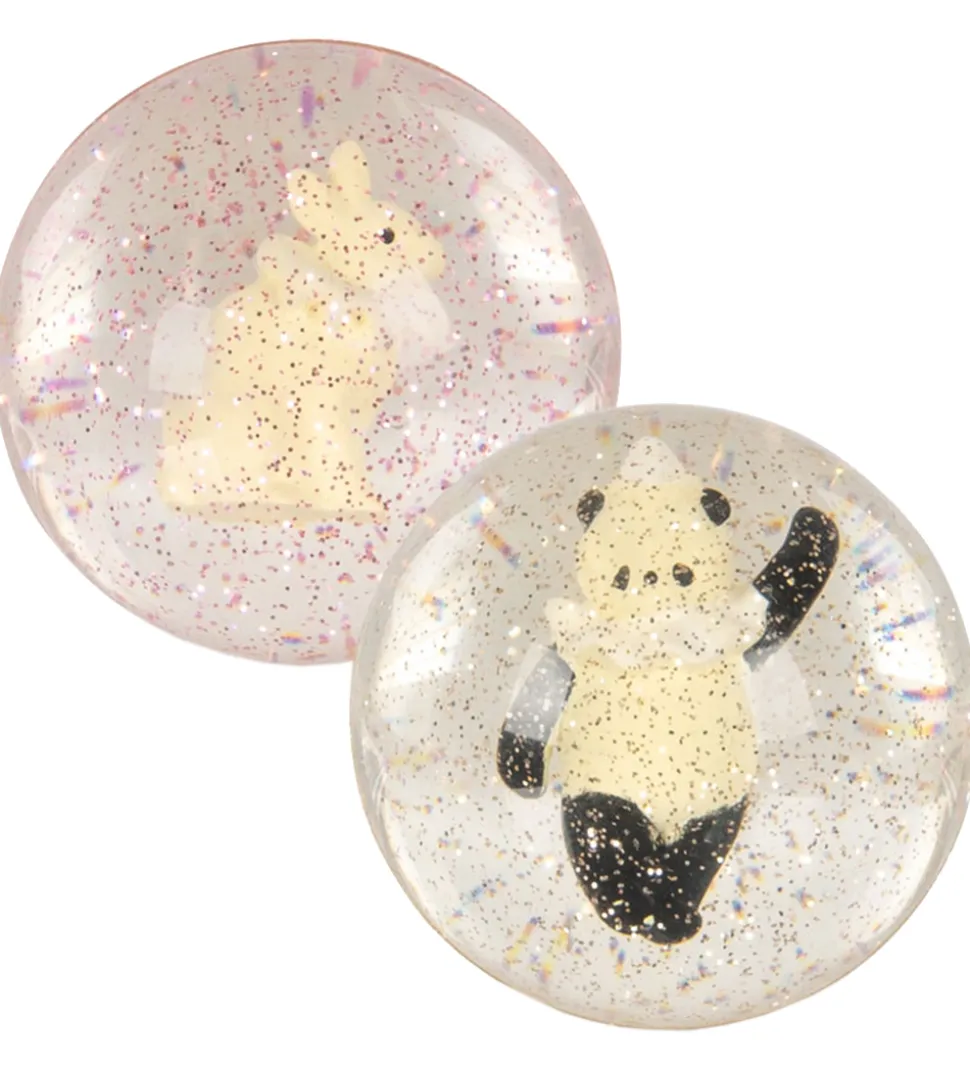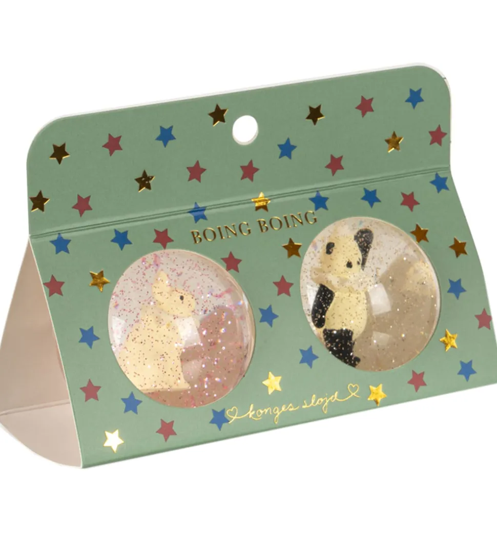 Sjove Konges Sløjd hoppebolde solgt som en 2-pak i transparent gummi med glimmer samt 3D-figurer af klassiske Konges Sløjd motiver, her: kanin og panda.