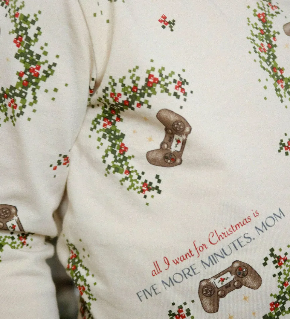 Behageligt Konges Sløjd nattøj bestående af en natbluse med lange ærmer og et par natbukser med elastisk talje i en skøn råhvid nuance. Nattøjet er dekoreret med et charmerende print af engle, stjerner og måner, der skaber et eventyrligt udtryk.