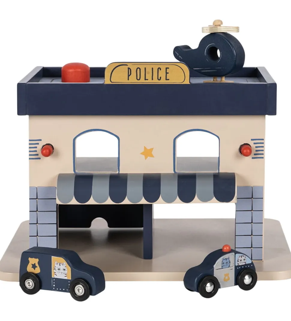 Konges Sløjd politistationen består af 3 etager, og der medfølger to politibiler samt en helikopter, som kan lande på taget. På den ene side sidder der en garageport, som kan åbne og lukke.