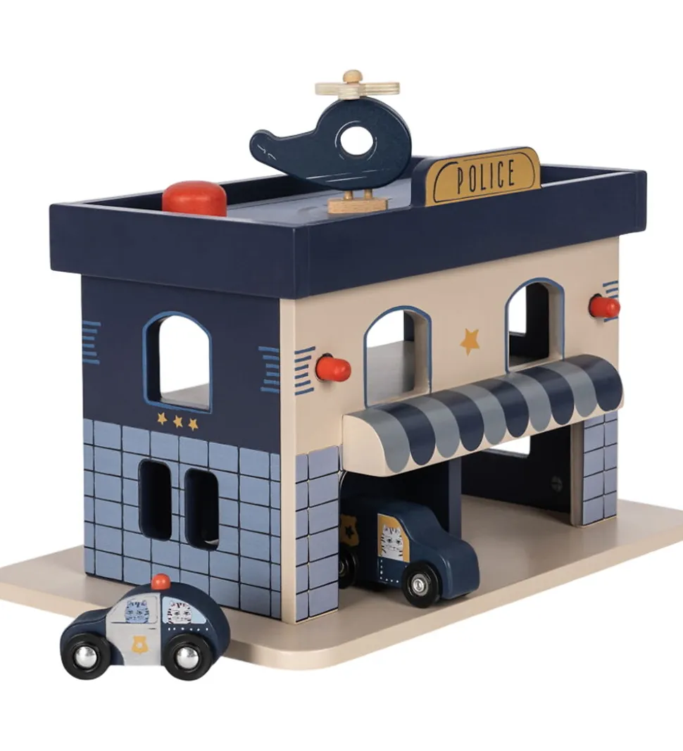Flot Konges Sløjd politistation i blå nuancer, og den er lavet af træ. med biler og helikopter af træ malet i røde og hvide farver og byder på timers sjov.
