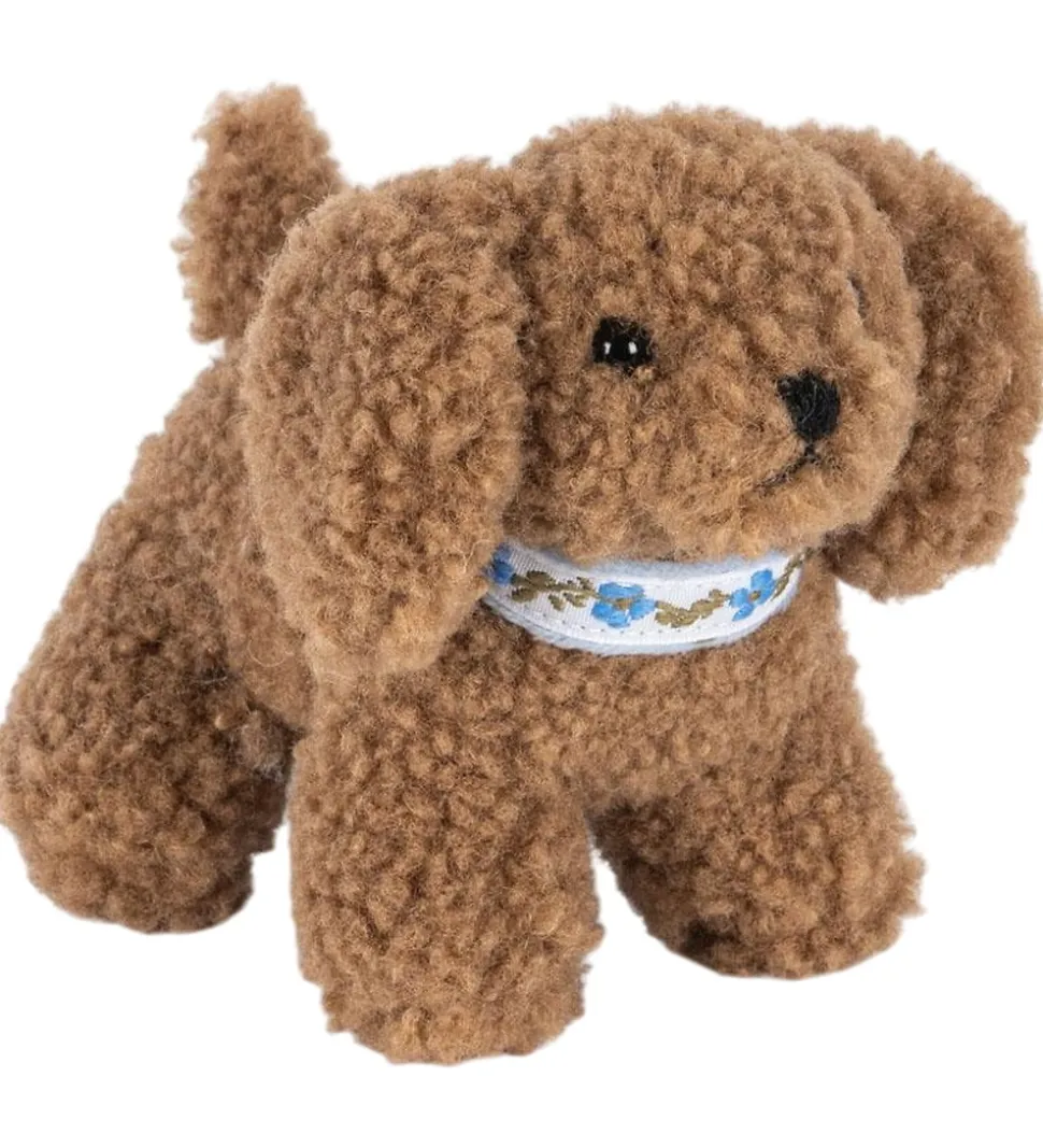 Charmerende Konges Sløjd rangle med form som en hund i brunt teddyfleece. Ranglen er lige til at gribe fat i for små barnehænder, og har en behagelig raslelyd når den rystes.