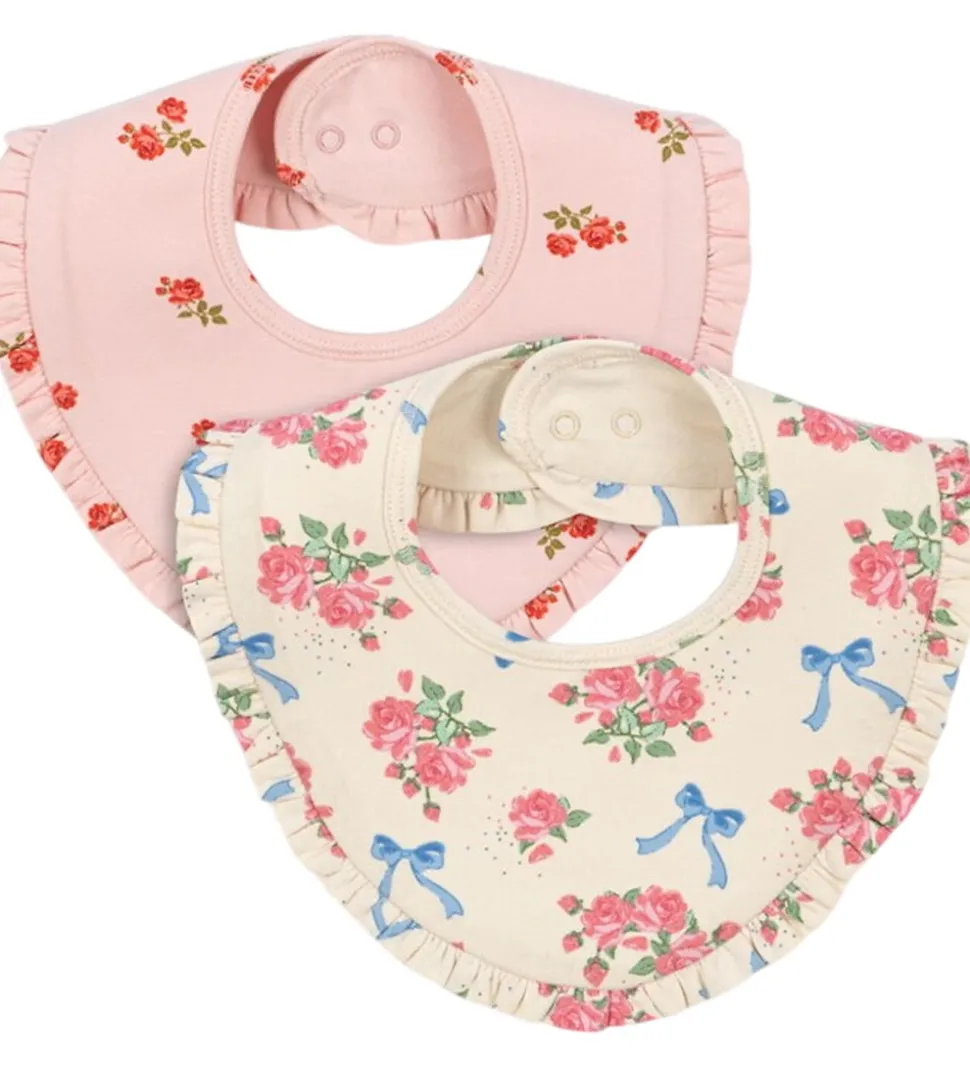 Elegante Konges Sløjd savlesmække i en 2-pak med en rosa og en cremefarvet. Begge har et fint blomstermønster og små flæser langs kanten.