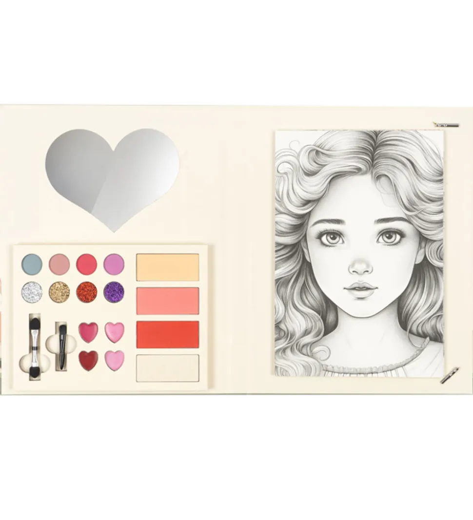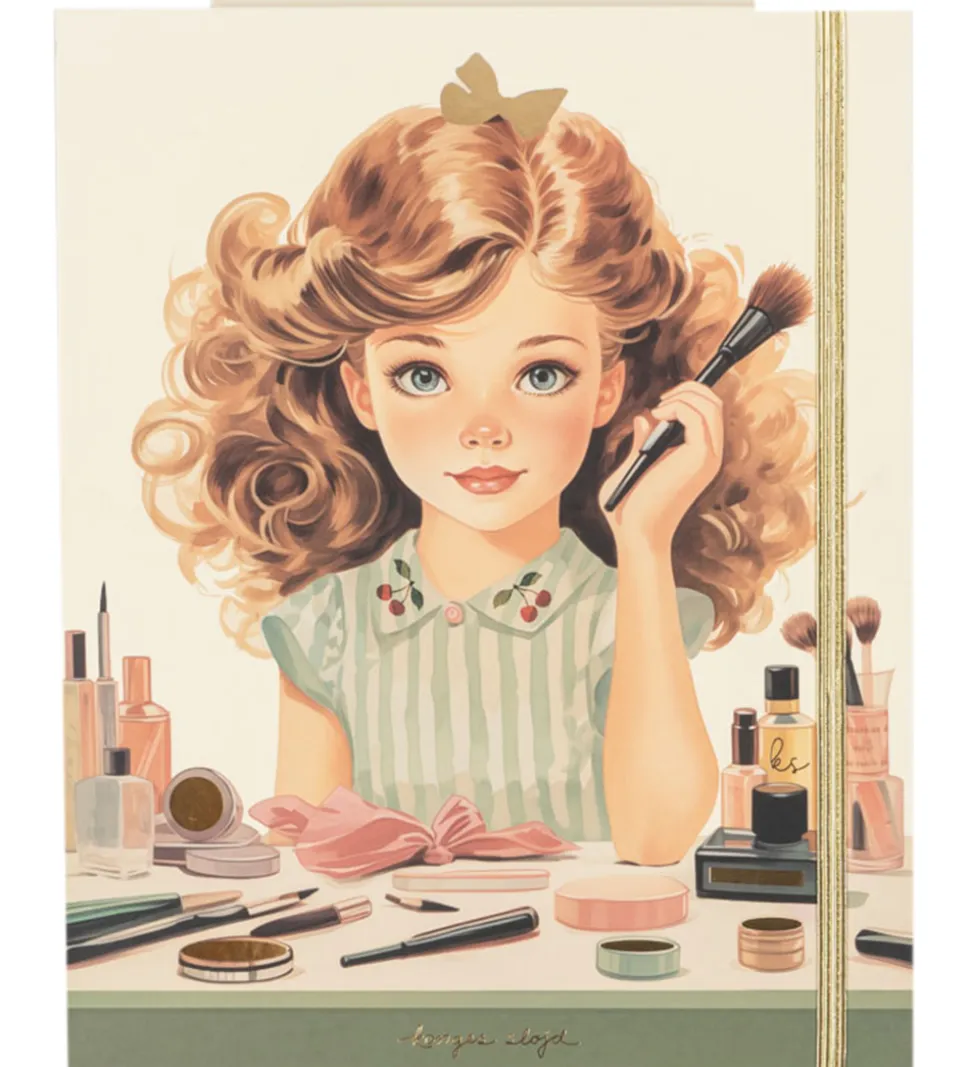 Sjovt Konges Sløjd sminke i form af denne “Glam Guide” lavet som en bog med et vintageprint af en pige med sminke. Glam Guiden består af:
