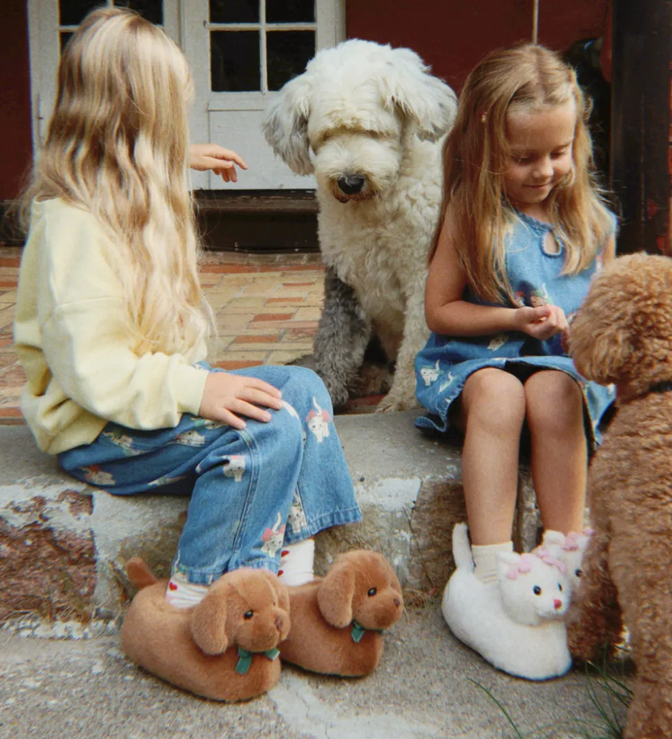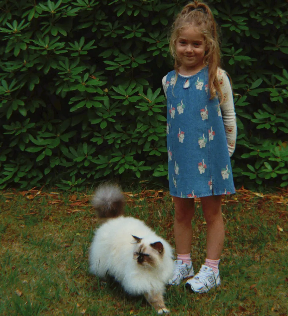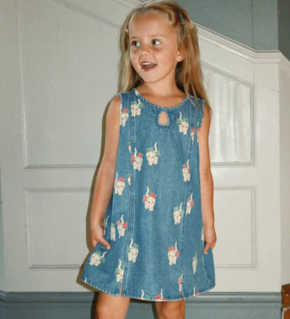 Fin Konges Sløjd spencer i lyseblåt denim. Spenceren har et sødt katteprint med røde og grønne sløjfer. Designet er ærmeløst med en rund halsudskæring og en lille knaplukning i nakken.