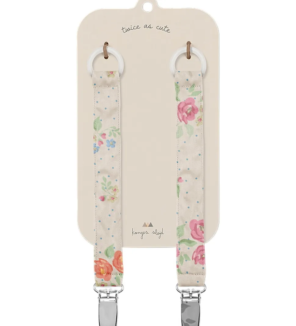 Fine Konges Sløjd suttesnorer solgt i en 2-pak i hvid med et farverigt blomsterprint og med blå prikker. Suttesnorerne fra Konges Sløjd har en metalclips, som sættes fast på tøjet og en ring øverst, hvor sutten sættes fast.