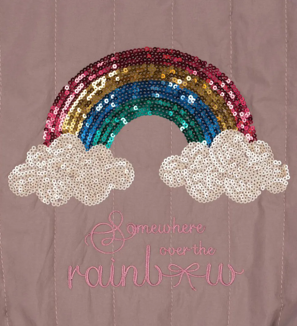 Fin Konges Sløjd termojakke i qulitet, støvet lilla, og med et farverigt palietprint af regnbuer.
