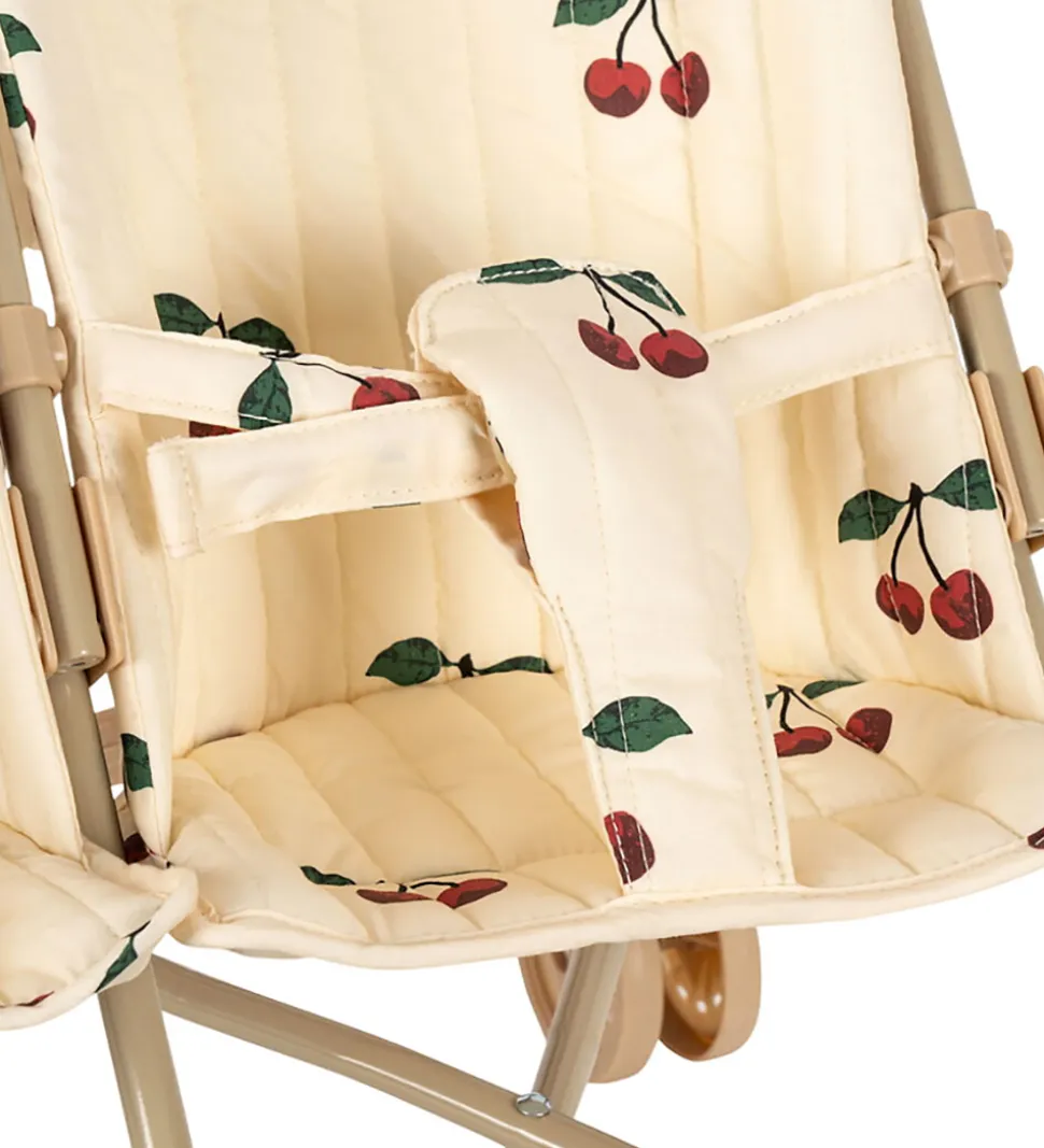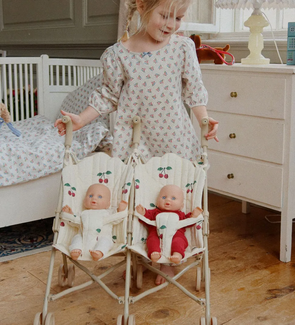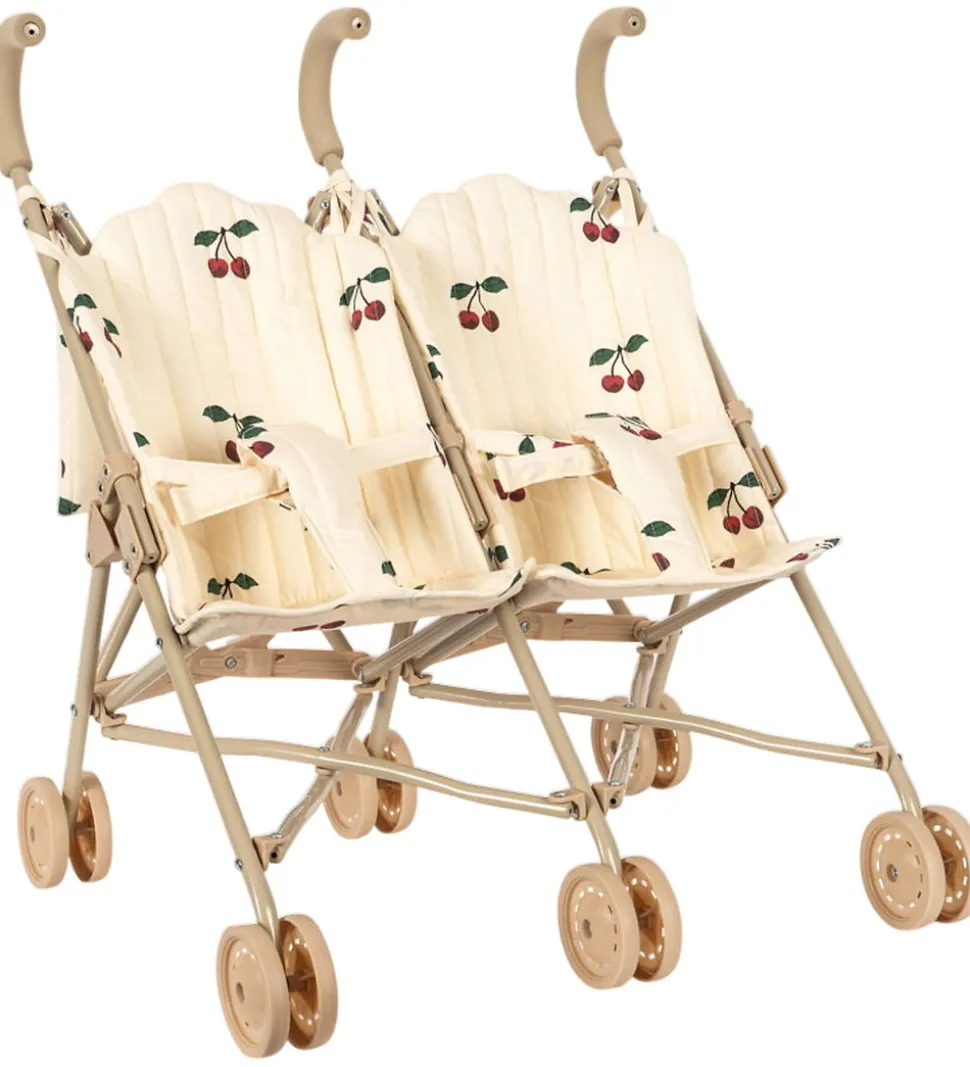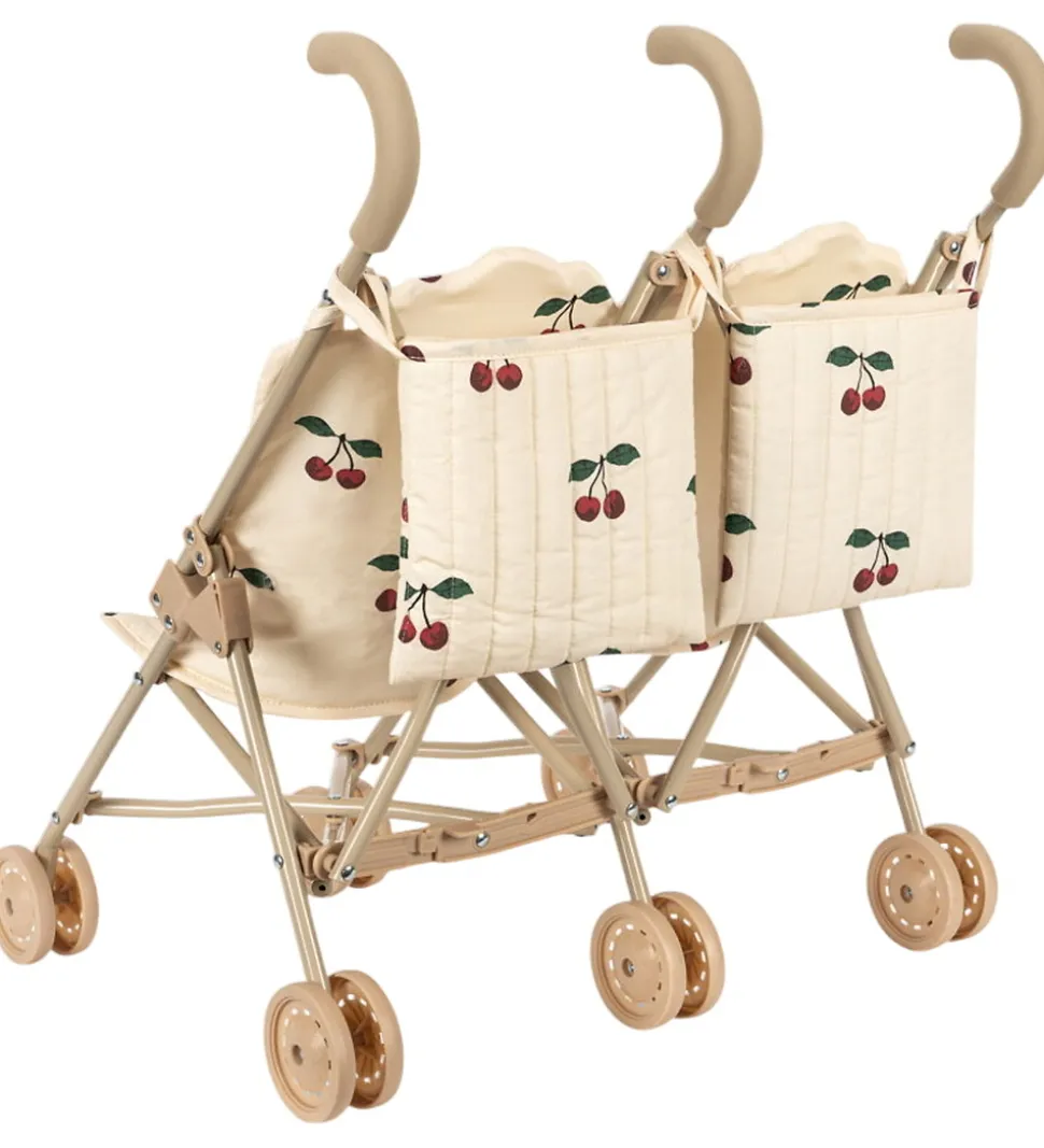 Flot Konges Sløjd dukkeklapvogn til to dukker i cremefarvet bomuld med er print med røde kirsebær.