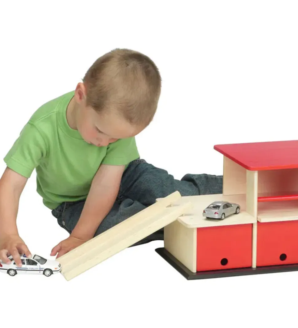 Krea garagen består af 2 etager, og i den ene side er der en rampe, som bilerne kan køre op ad for at komme op på det øverste dæk, hvor der er god plads til at parkere. På nederste etage er der to porte, som kan åbne og lukke, og der er også en gul benzinstander. Her er mulighed for mange timers fantasifuld leg.