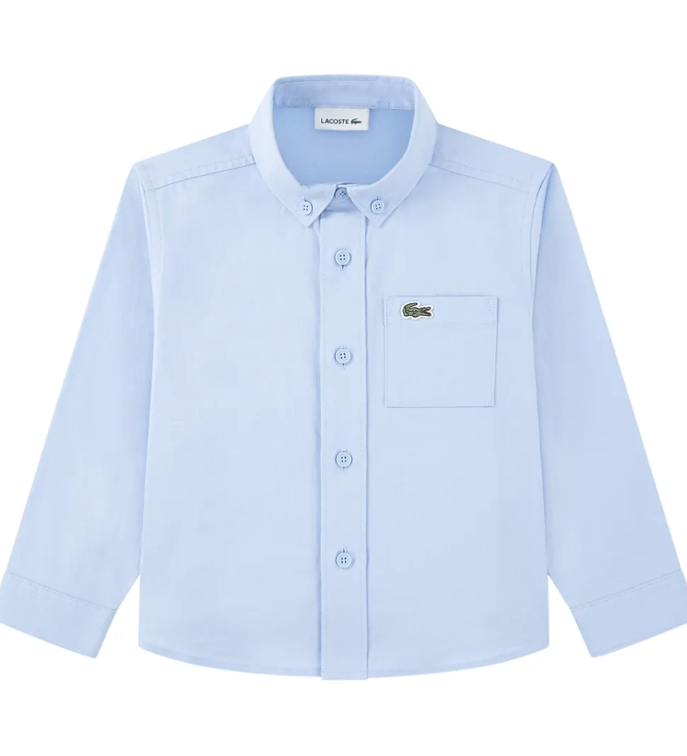 Stilren Lacoste skjorte i lyseblå med lange ærmer og klassisk krave. Skjorten har en praktisk brystlomme med Lacoste-logo, der tilføjer et diskret touch. Den gennemgående knaplukning gør den let at bruge og giver et tidløst udtryk.
