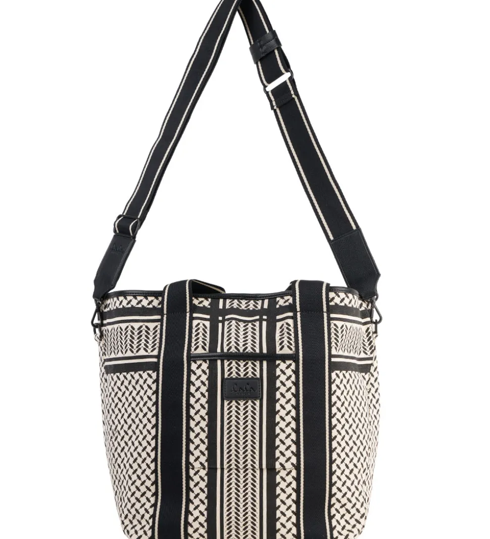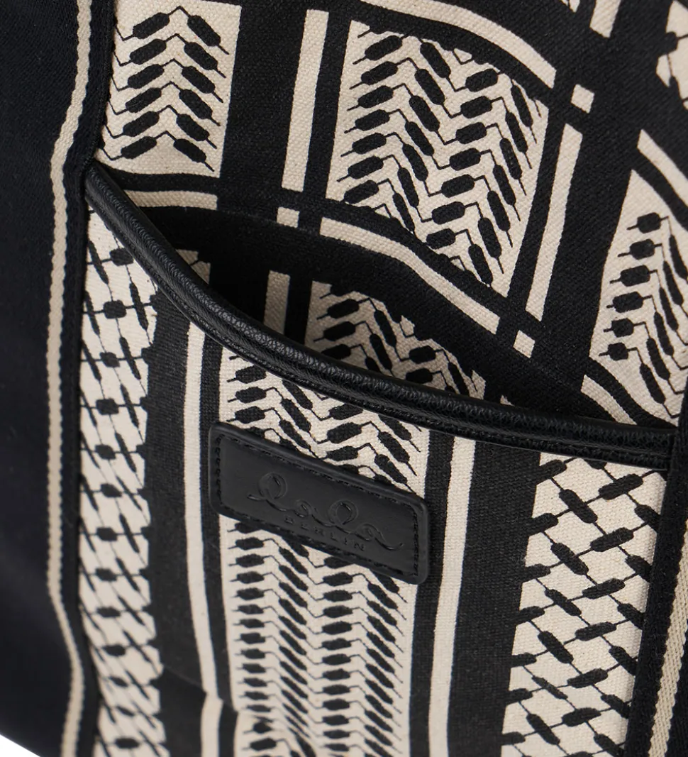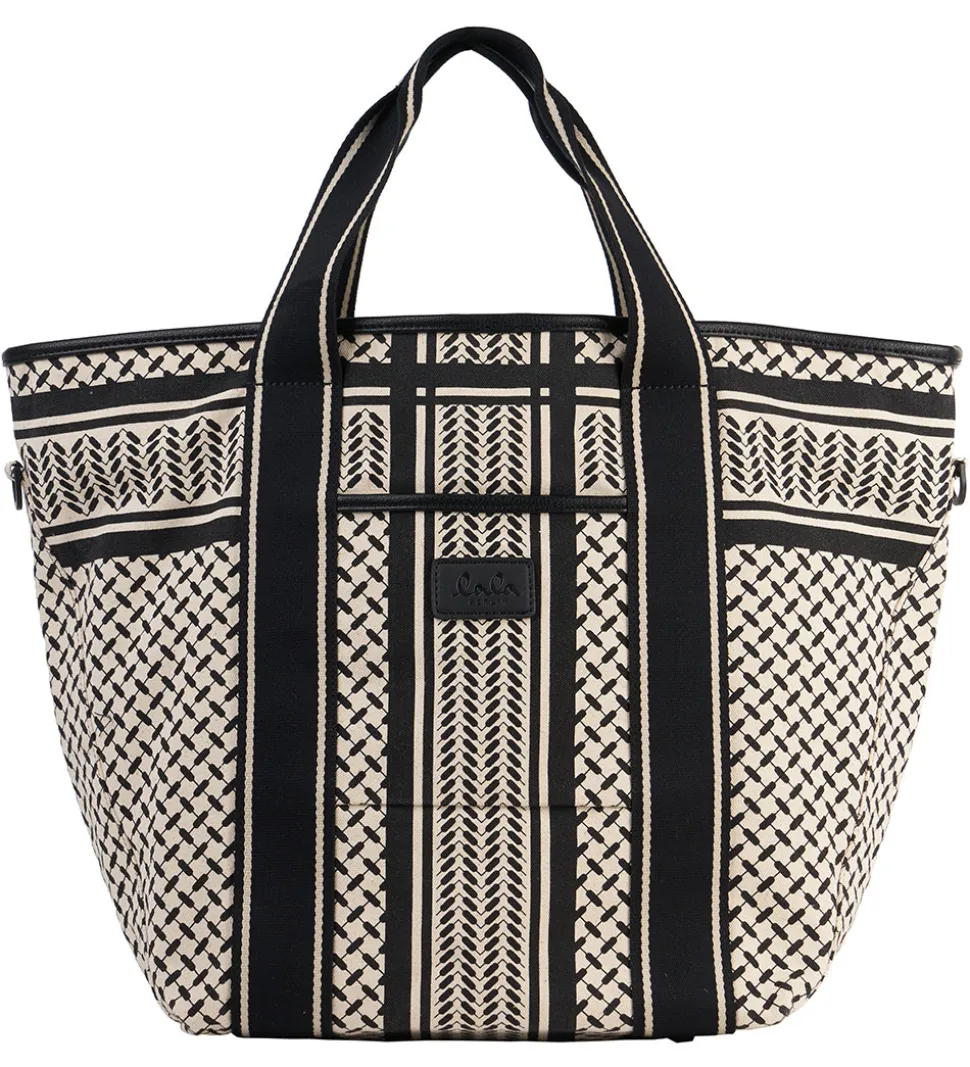 Smuk Lala Berlin shopper i hvid kanvas med det klassiske Kufiya print i sort. Shopperen har et sort logo i læder på den ene side.