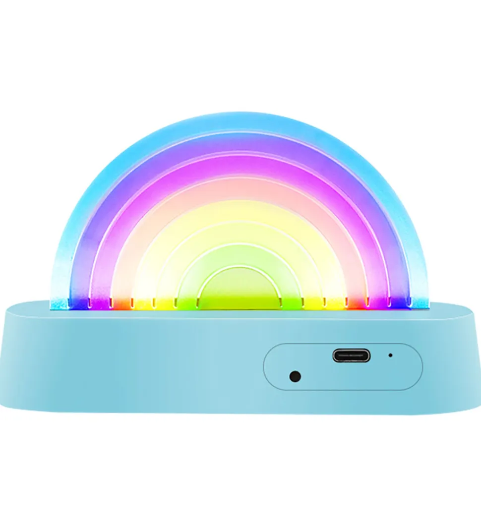 Skøn Lalarma lampe med form som farverig regnbue i otte nuancer og med en blå base.