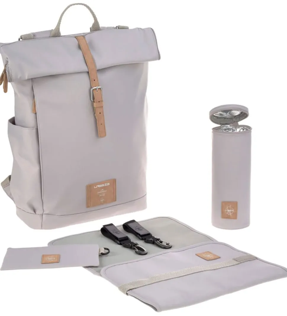 Lässig pusletasken skiller sig ud ved at være designet som en rygsæk, som har polstrede, justerbare skulderstropper samt en let polstret ryg. Der er også en bærehank i toppen og desuden to ringe, så pusletasken kan monteres på en barne- eller klapvogn i kombination med de medfølgende karabinhager med velcrostropper.