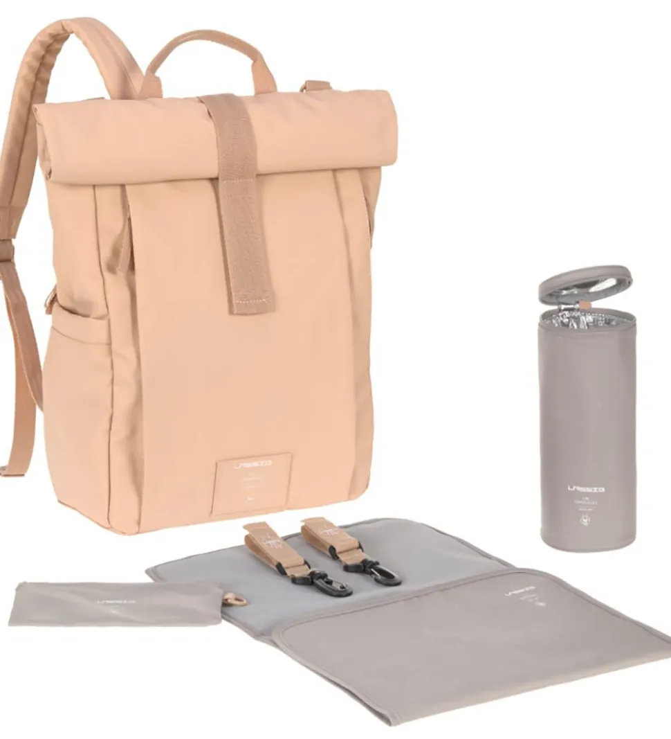 Lässig pusletasken skiller sig ud ved at være designet som en rygsæk, som har polstrede, justerbare skulderstropper samt en blødt polstret ryg af mesh for åndbarhed. På tværs af ryggen går en bred rem til udvendig opbevaring. Der er også en bærehank i toppen og desuden to ringe, så pusletasken kan monteres på en barne- eller klapvogn i kombination med de medfølgende karabinhager med velcrostropper.