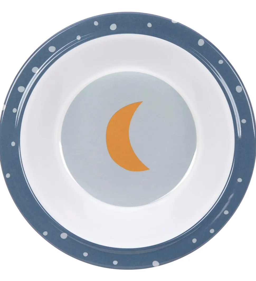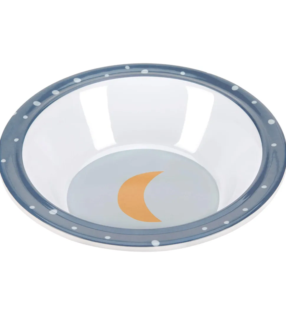 Smart Lässig skål i hvid med en fin blå kant med hvide prikker, samt en blå bund med en flot måne.