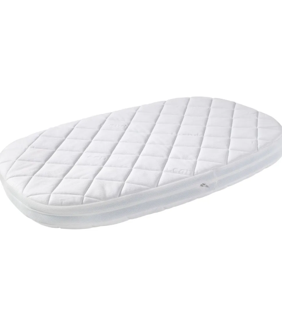 Leander madrassen har rundede hjørner, og den passer lige ned i en Leander Classic tremmeseng. Madrassen er lavet af polyuretan-skum. Alt efter hvilken side, der vender opad, giver madrassen den bedste liggekomfort for henholdsvis den lille baby (op til 12 kg) og det lidt større barn. Babysiden er quiltet med et åndbart 3D luftpudelag og vaskbar fleece.