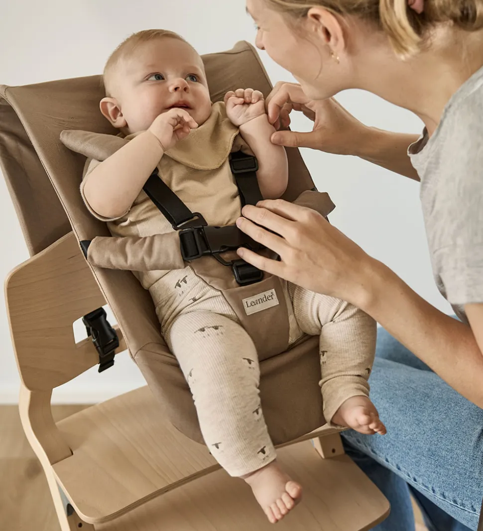 Fin højstol fra Leander i en smuk, lysebrun naturfarve.