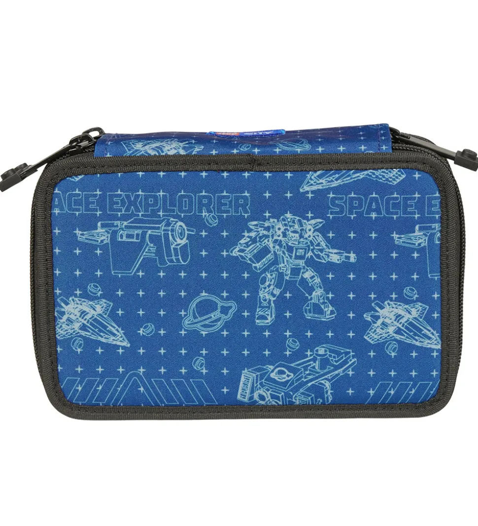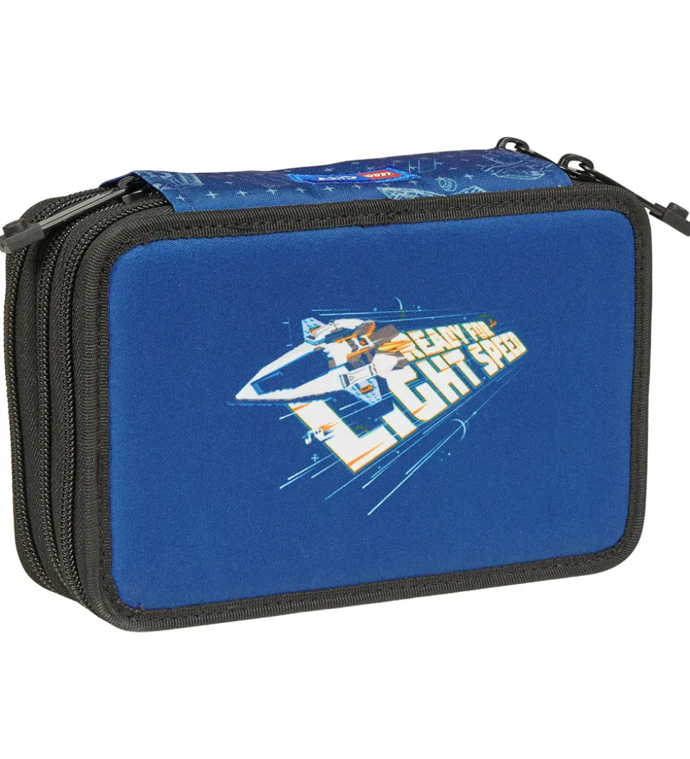 Smart LEGO® City penalhus i mørkeblå og sort med en rumrasket og teksten “Ready For Light Speed” i hvid på den ene side og forskellige motiver fra rummet og teksten “Space Explorer” på den anden side.