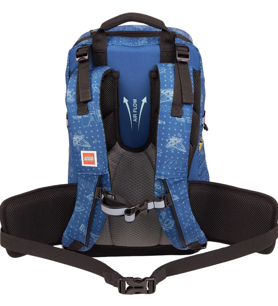 Flot LEGO® City skoletaske i blå med motiver fra rummet og teksten “Ready For Light Speed” i hvid.