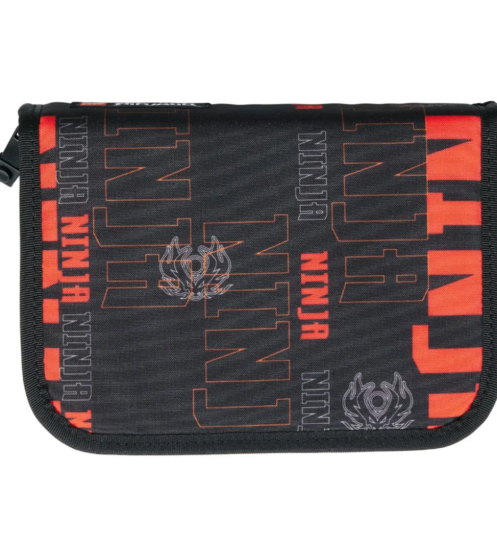 Sejt LEGO® Ninjago penalhus i sort med et Ninjago-print i orange på den ene side og teksten “Ninja” i forskellige skrifttyper i rød, orange og grå på den anden side.