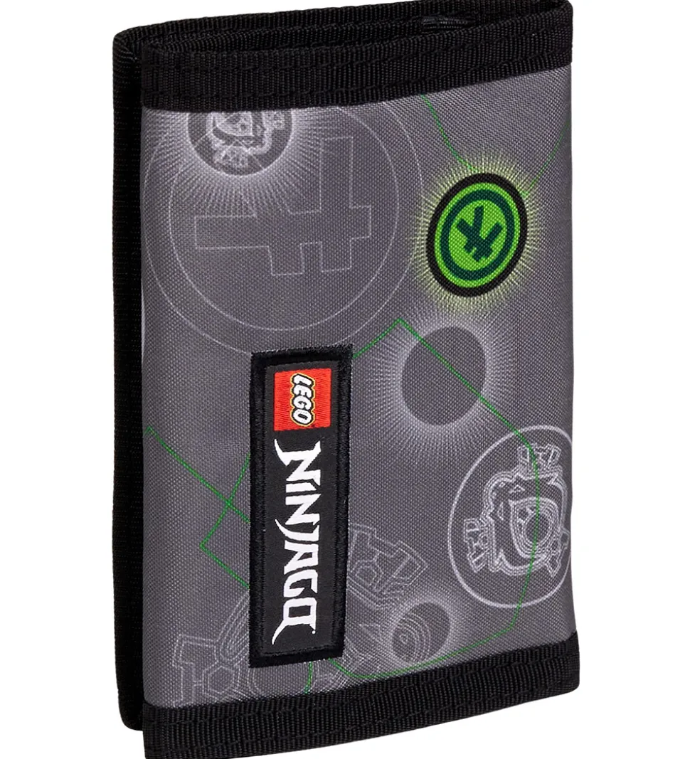 Sej LEGO® Ninjago pung i grå og sort med Ninjago-print i grøn og lysegrå. På forsiden er der et logo.