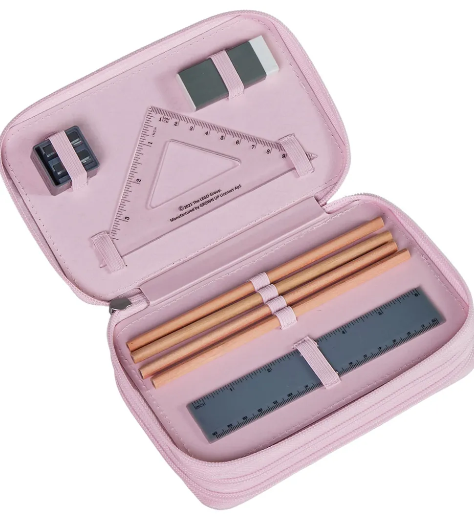 LEGO® penalhuset består af tre separate rum, der alle åbnes med lynlås. Penalhuset indeholder alle de nødvendige skriveredskaber, der er behov for i løbet af en skoledag: 4 blyanter, 18 farveblyanter, 2 tykke blyanter, 4 tykke farveblyanter, viskelæder, blyantspidser, lineal, vinkelmåler samt et skema. Indvendigt er der rosa tekstil, og i det ene rum er der et navneskilt og en lomme til skoleskema.
