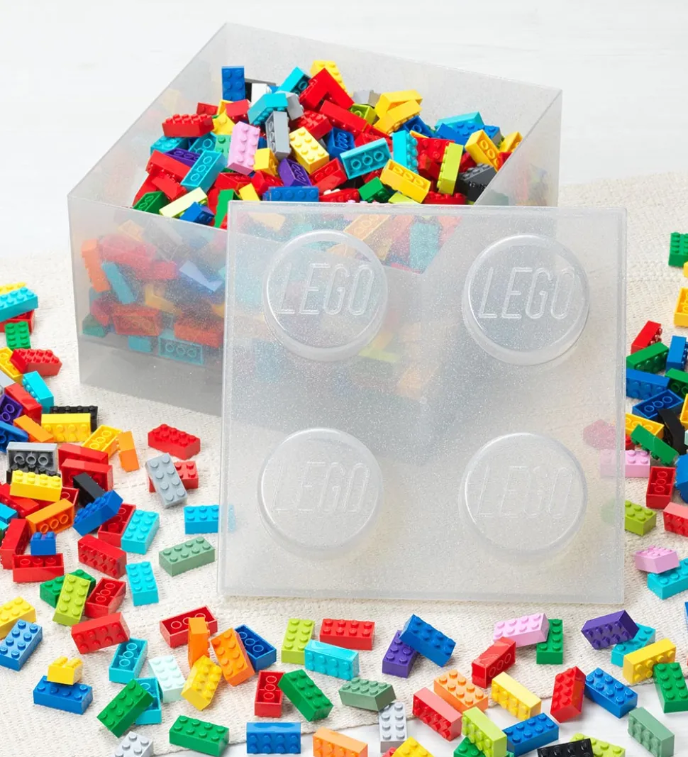 Fin LEGO® Storage opbevaringsboks i hvid med glimmer som en ægte LEGO® klods.