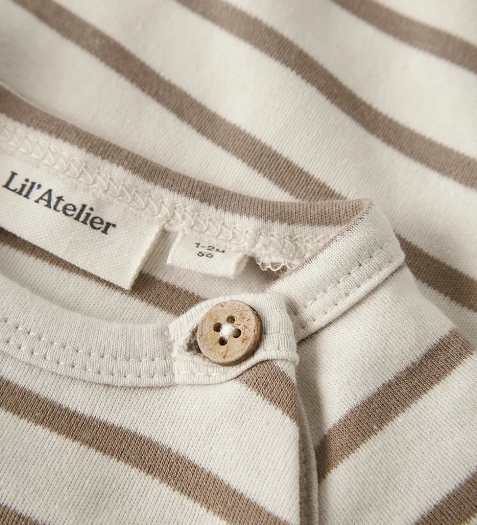 Smart Name It body i beige med smalle, brune striber. Bodyen har en rund halsudskæring med knapper ved venstre skulder og lange ærmer. Den lukkes med trykknapper mellem benene.