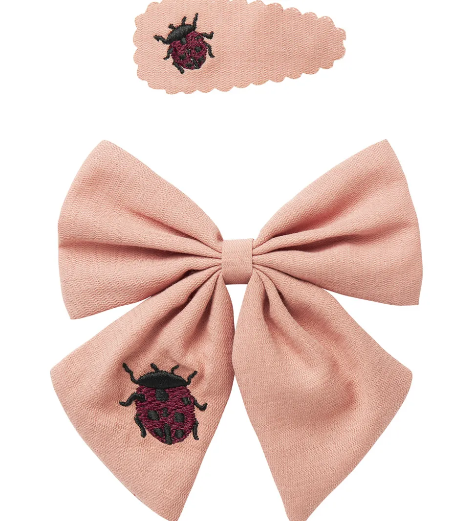 Søde Lil Atelier hårspænder i en lys rosa nuance med en broderet mariehøne på hvert hårspænde. Lil Atelier hårspænderne består af et spænde med en stor sløjfe på og et mindre trekantet hårspænde. Hårspænderne tilføjer et elegant touch til enhver frisure.