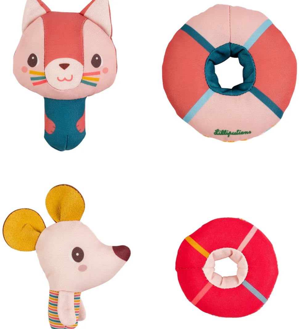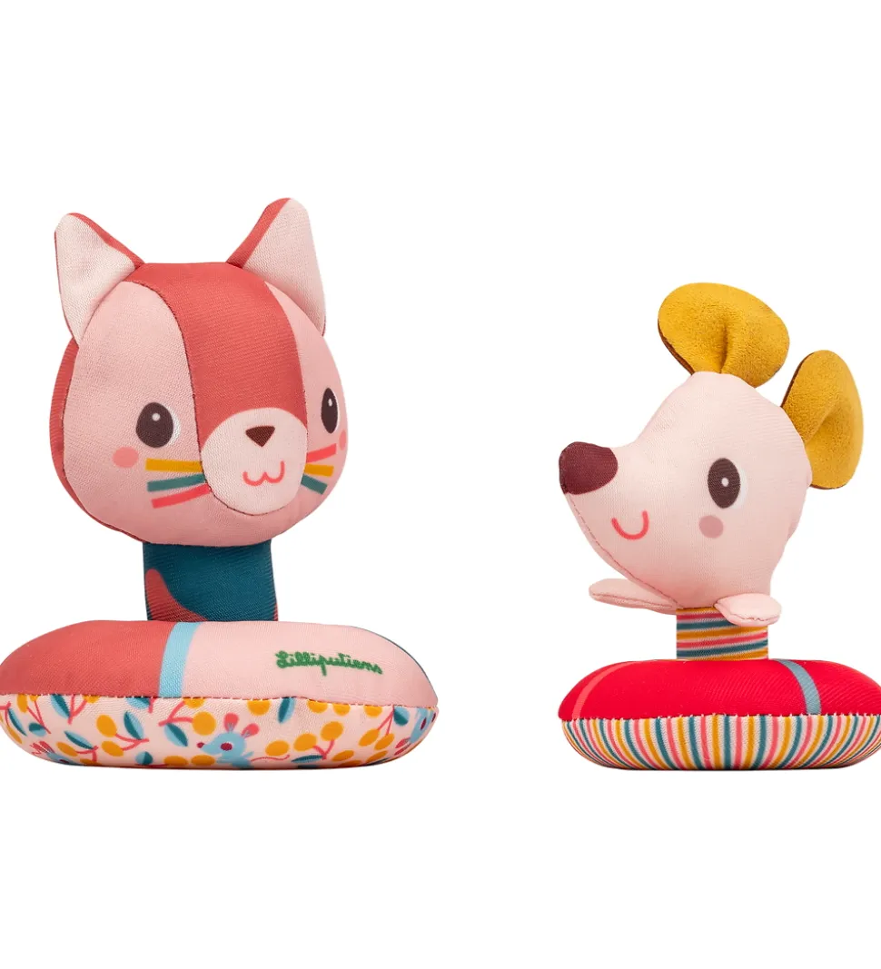 Sjovt Lilliputiens badelegetøj med en kat gog en mus i rosa med farverige baderinge. Begge figurer er designet med farverige detaljer og en spids, som kan sættes ned i baderingene. Badelegetøjet flyder på vandet, og bringer leg ind i badetiden.