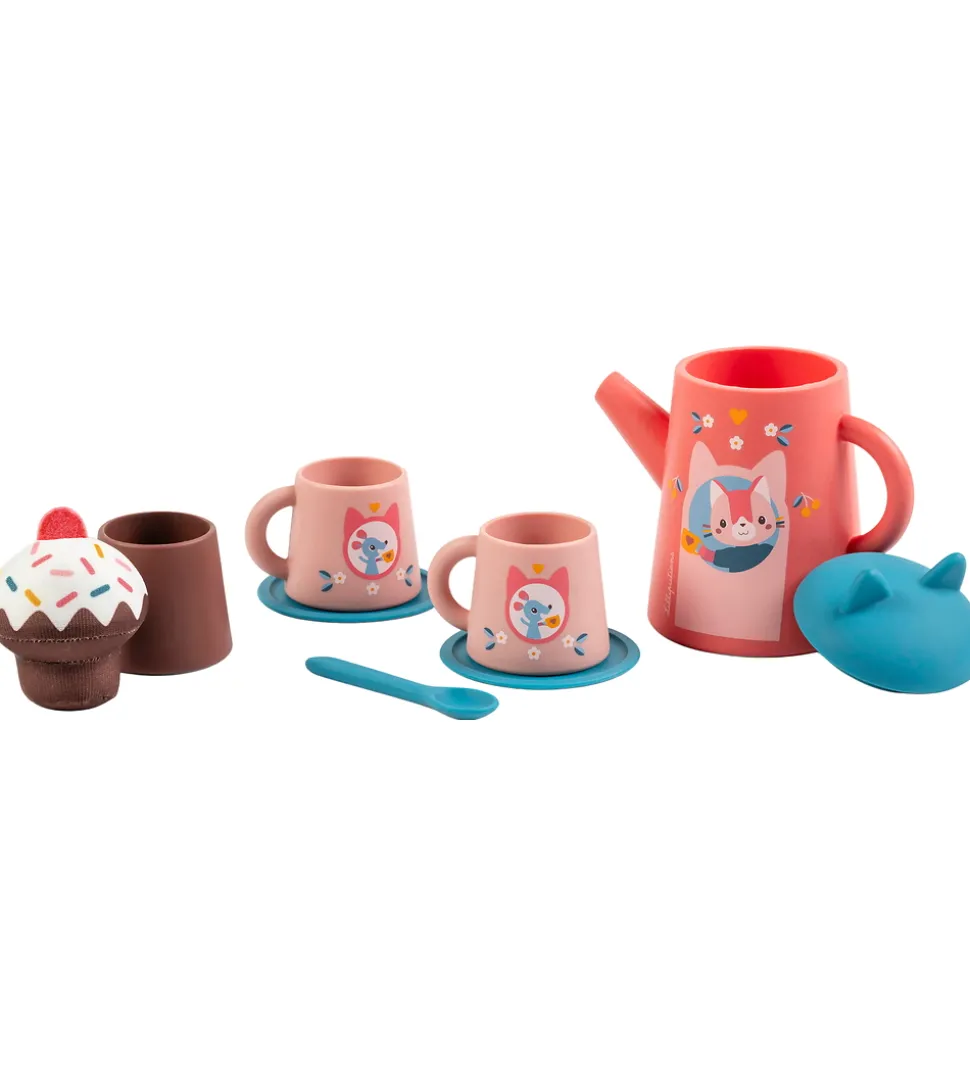 Fint Lilliputiens badelegetøj bestående af ni dele med print af katten Jeanne og små mus. Badelegetøjet er i rosa, blå og brune farver og består af en tekande, kopper, underkopper, en ske og en kage. Perfekt til fantasifuld leg i badet.