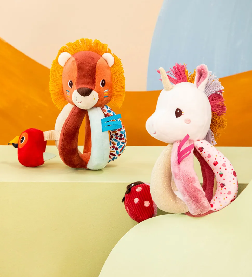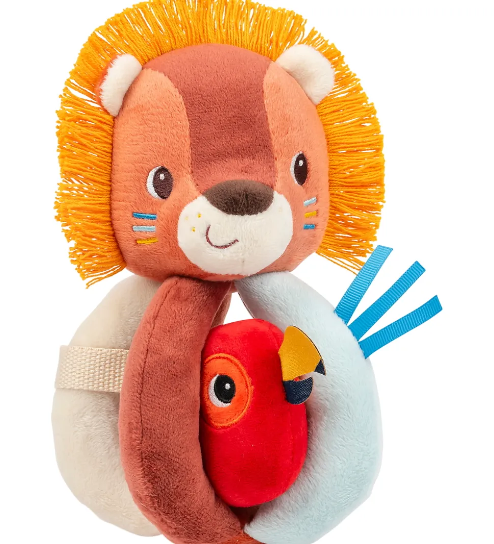 Charmerende Lilliputiens rangle udformet som løven Jack i primært rød og orange med forskellige mønstre og forskellige overflader. Lilliputiens ranglen har en en sjov manke, små frynser, knitrelyde og en fugl med raslelyd, som kan gemmes i midten af ranglen. Ranglen siger en beroligende lyd, når man ryster den, og den er let at holde ved hjælp af de fem håndtag.