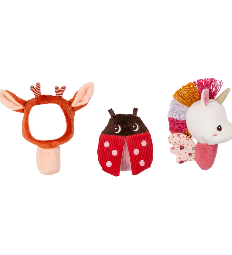 Fine rangler fra Lilliputiens solgt i en flot æske med tre forskellige figurer. Æsken indeholder et spejl med ører, en mariehøne med flagrende vinger i fløjl og en rangle formet som en enhjørning med knitrende vinger. Lilliputiens ranglerne har bløde former, der er lette for små hænder at gribe om. Ranglerne har farverige detaljer og stimulerer både syns-, føle- og høresansen.