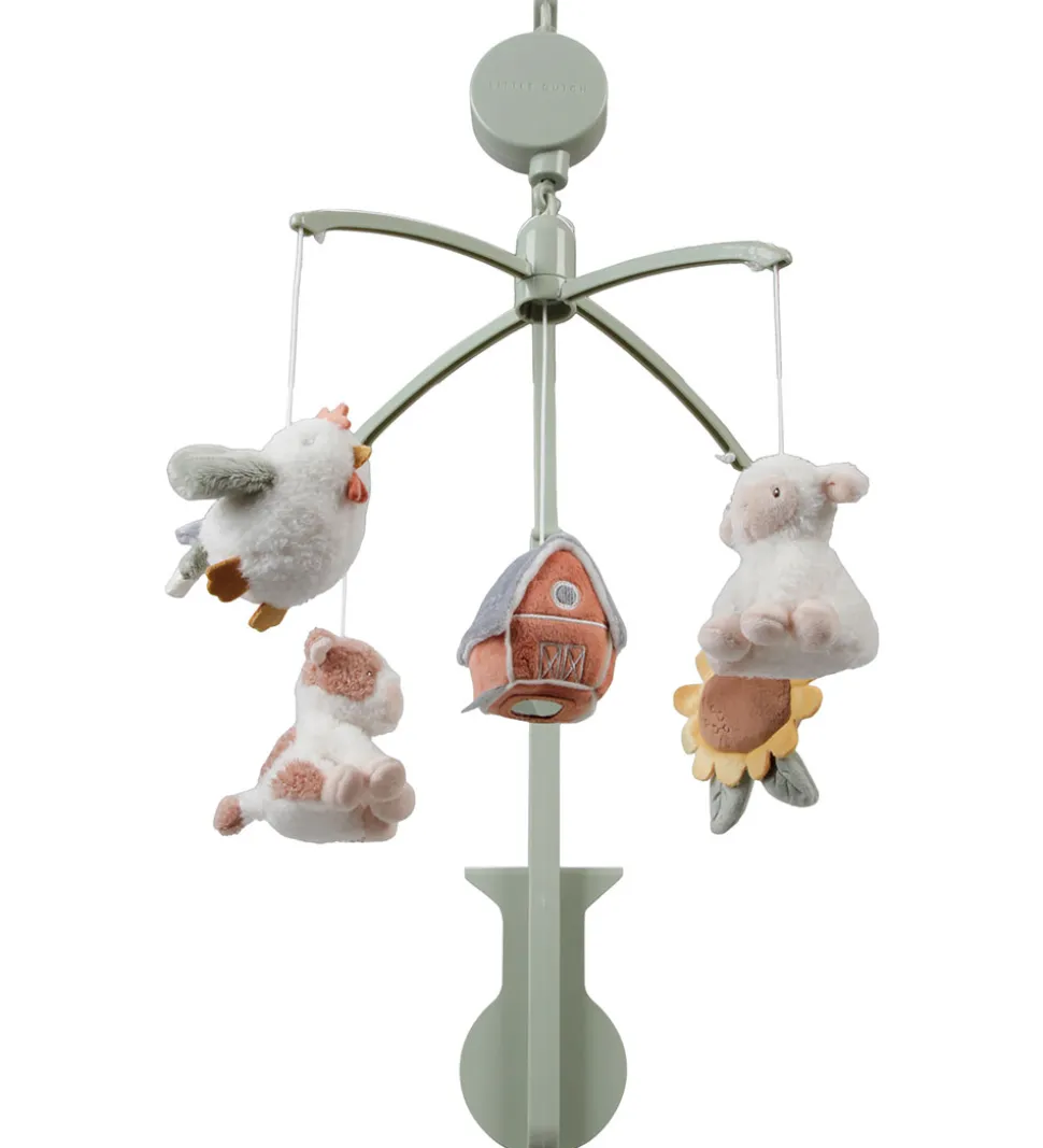 Hyggelig Little Dutch musikuro i støvet grønt med et hyggeligt bondegårdstema. Den har fem bamse-vedhæng i form af en høne, en ko, et får, en lade og en solsikke.