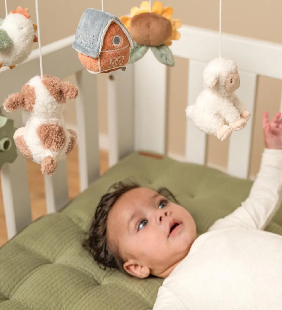 Little Dutch musikuroen spiller melodien “Somewhere Over The Rainbow”, som er dejligt beroligende. Uroen er nem at gøre ren med en blød, fugtig klud og vedhængene kan tages af og komme i vaskemaskinen.